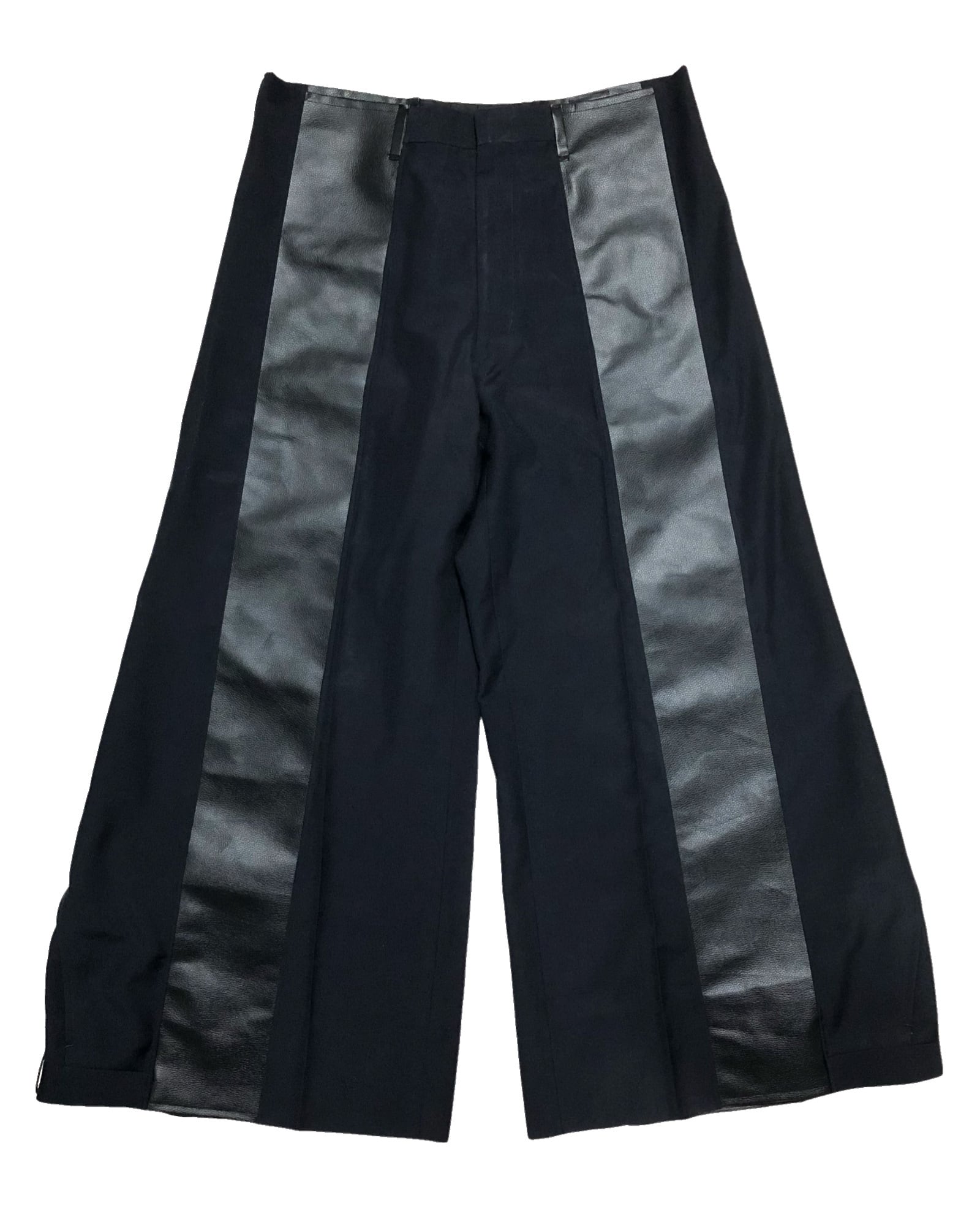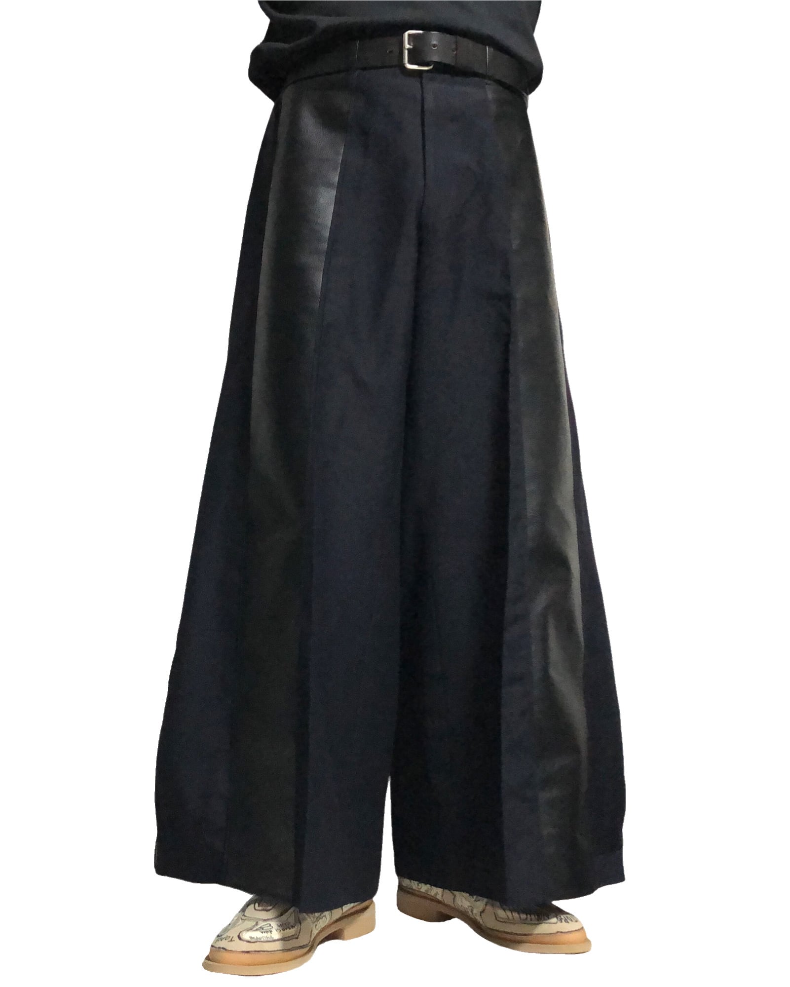 フロントとバックにPVCレザーの切り替えが入ったワイドフレアスラックス。