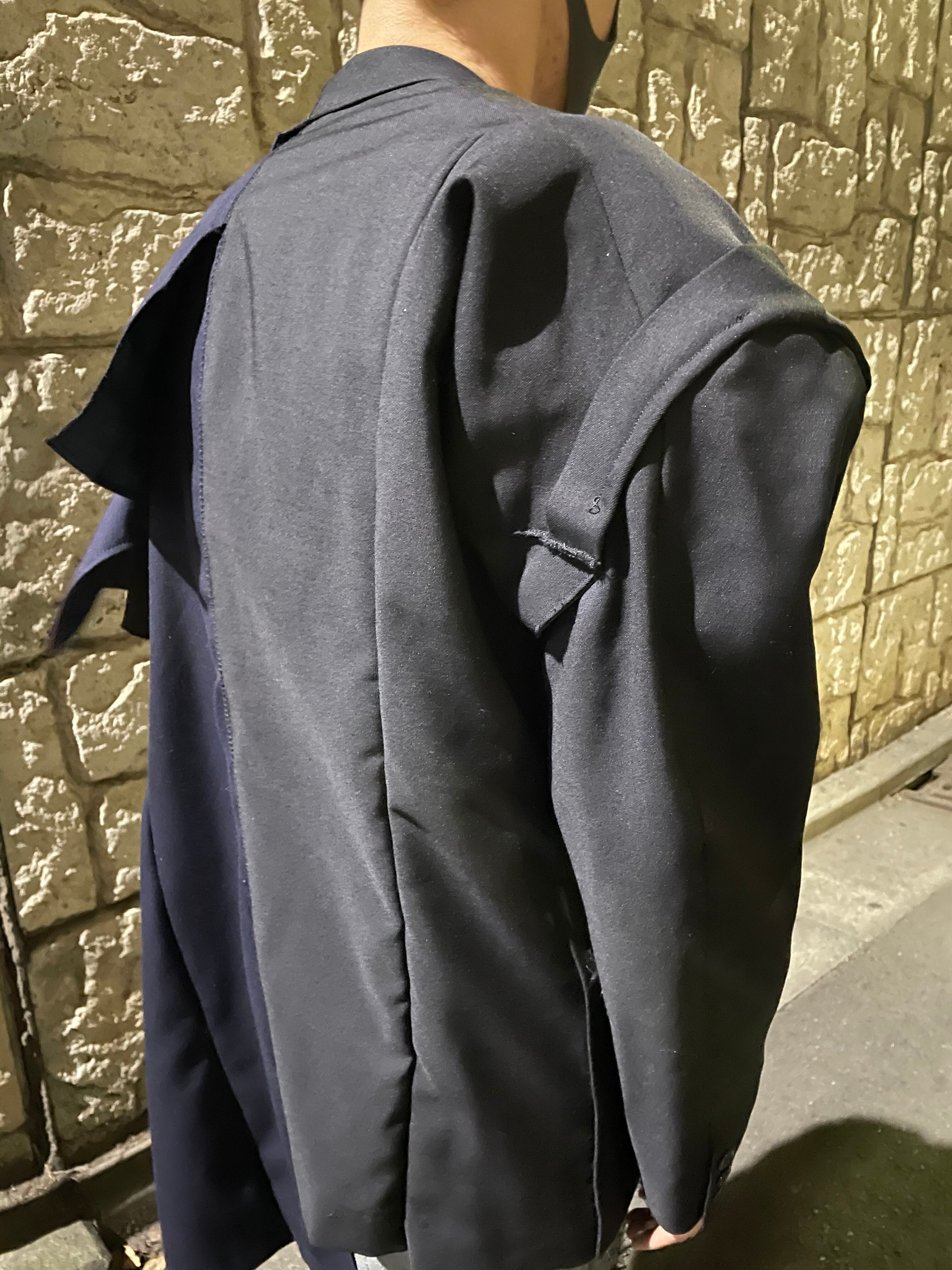テーラードジャケットとトレンチコートが合わさり、肩の境目から対象にラペルが配置されてるデザイン。