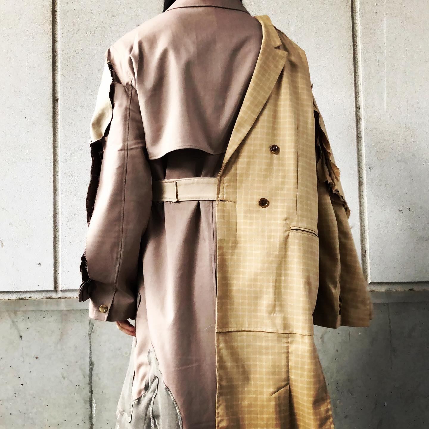 ステンカラーコート、テーラードジャケット、ワークシャツを合わせたタイロッケンコート。