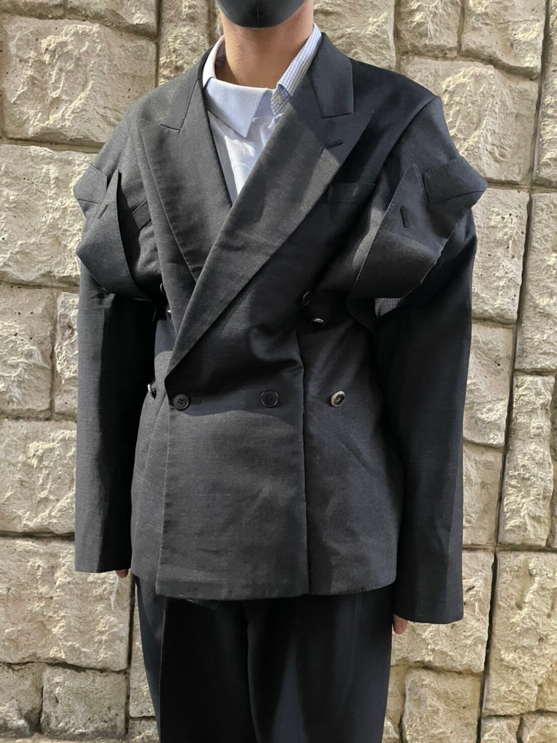 肩の境目からラペルが対象に配置されてるジャケット。脇から袖を出しノースリーブでの着用も可能です。