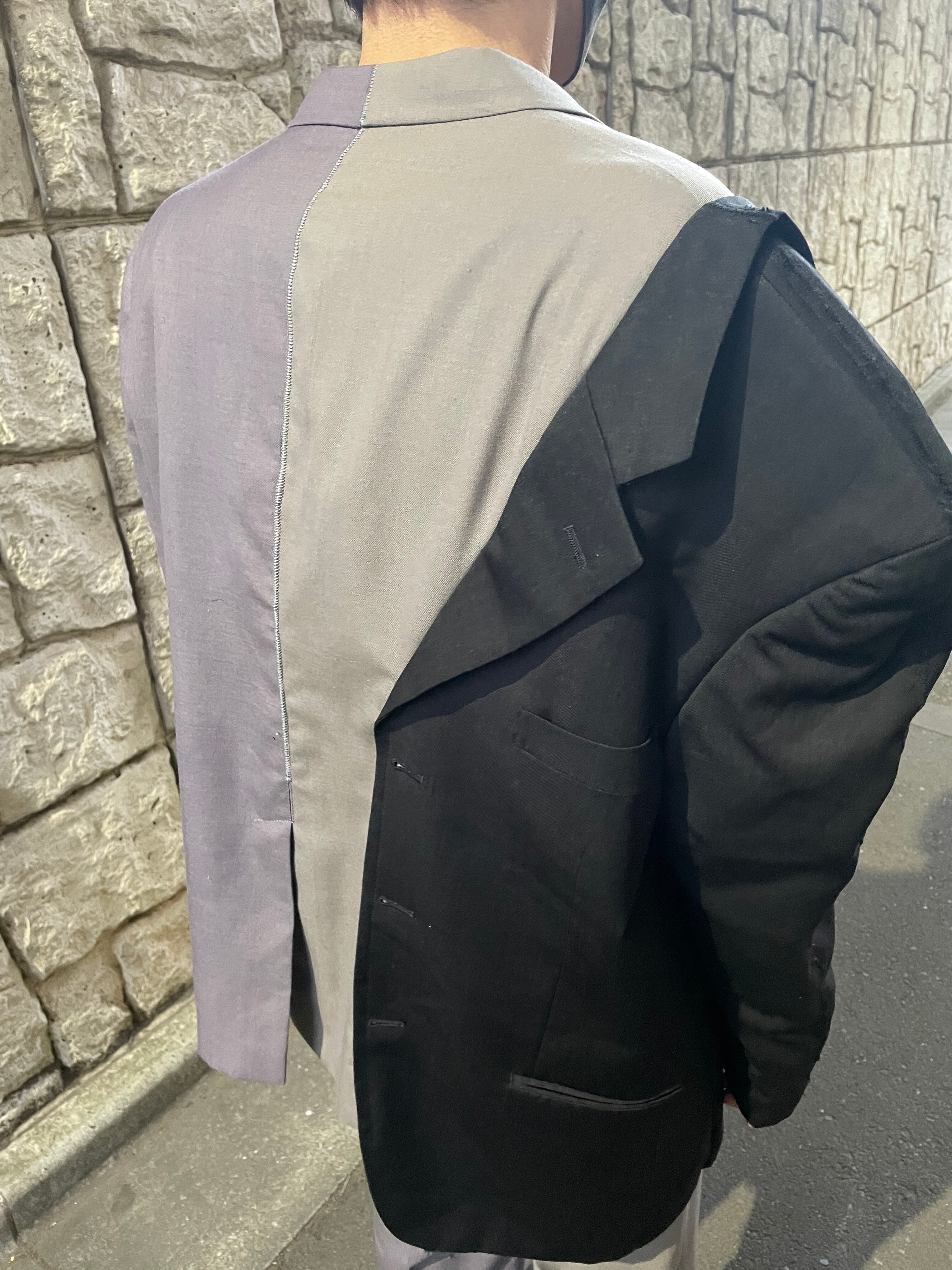 左右で異なる色味のジャケットの片側に、もう一つのジャケットがレイヤードされているデザイン。