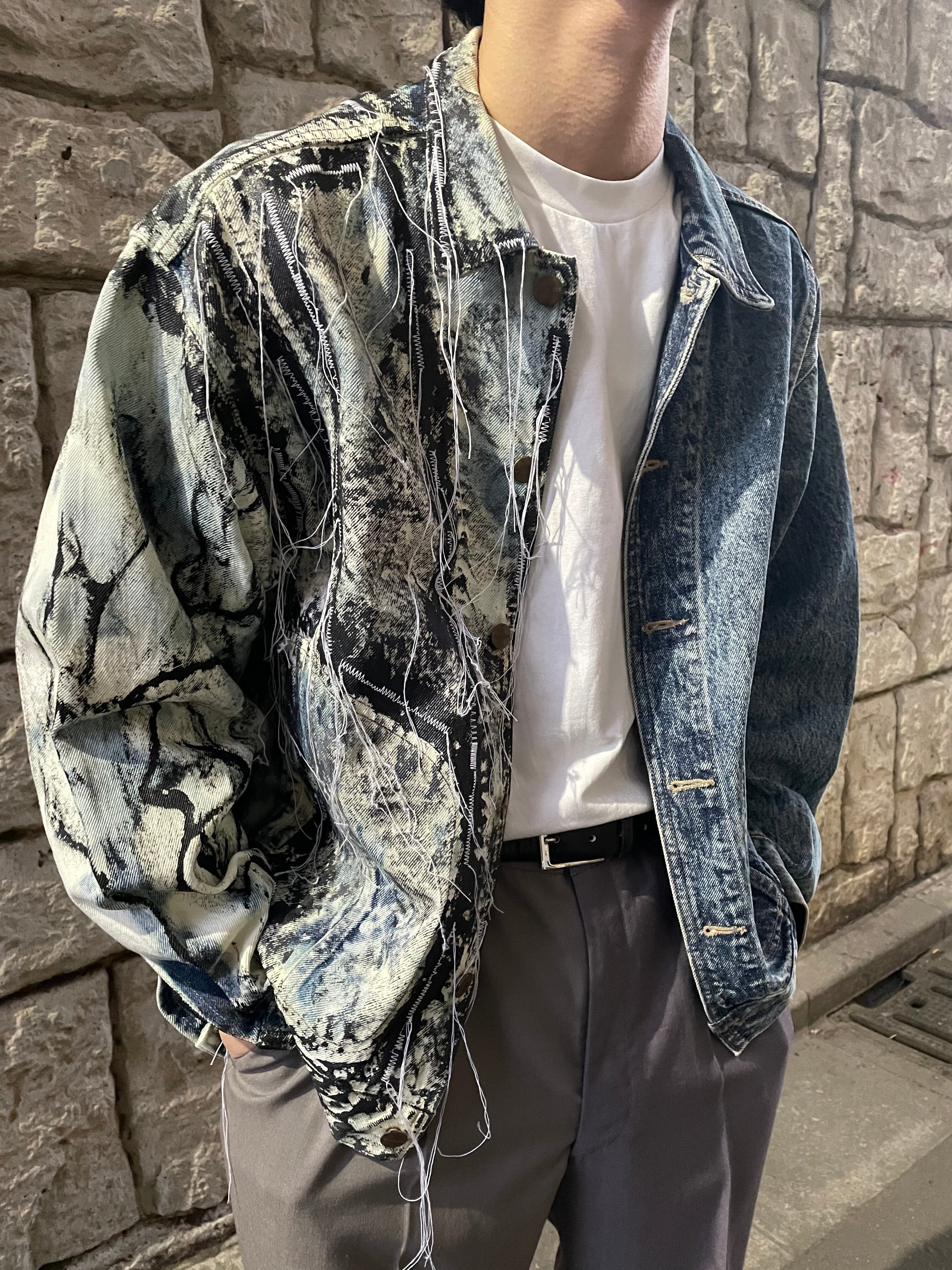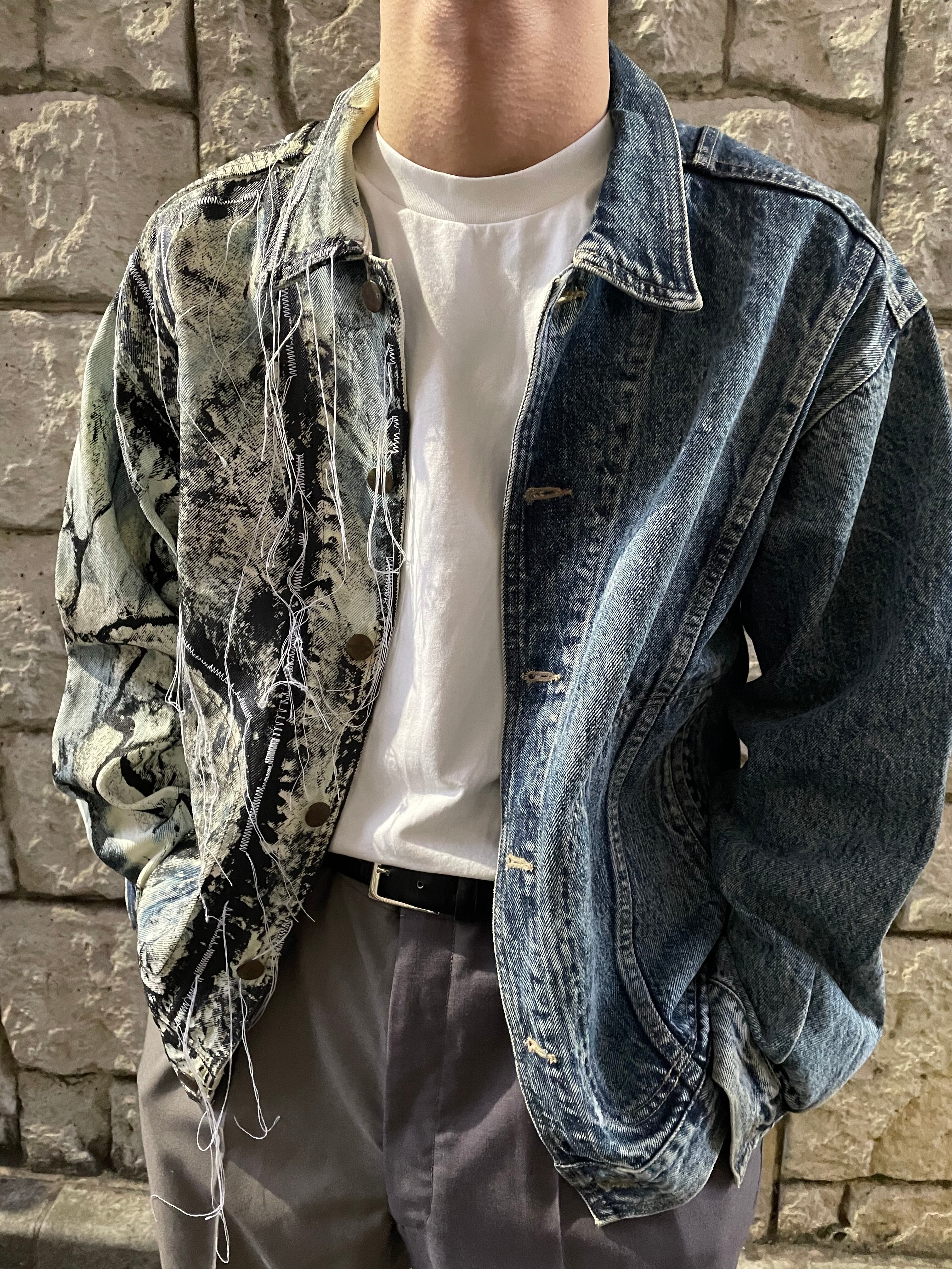 片側を抜染してその上からハンドペイントとステッチを施したデニムジャケット