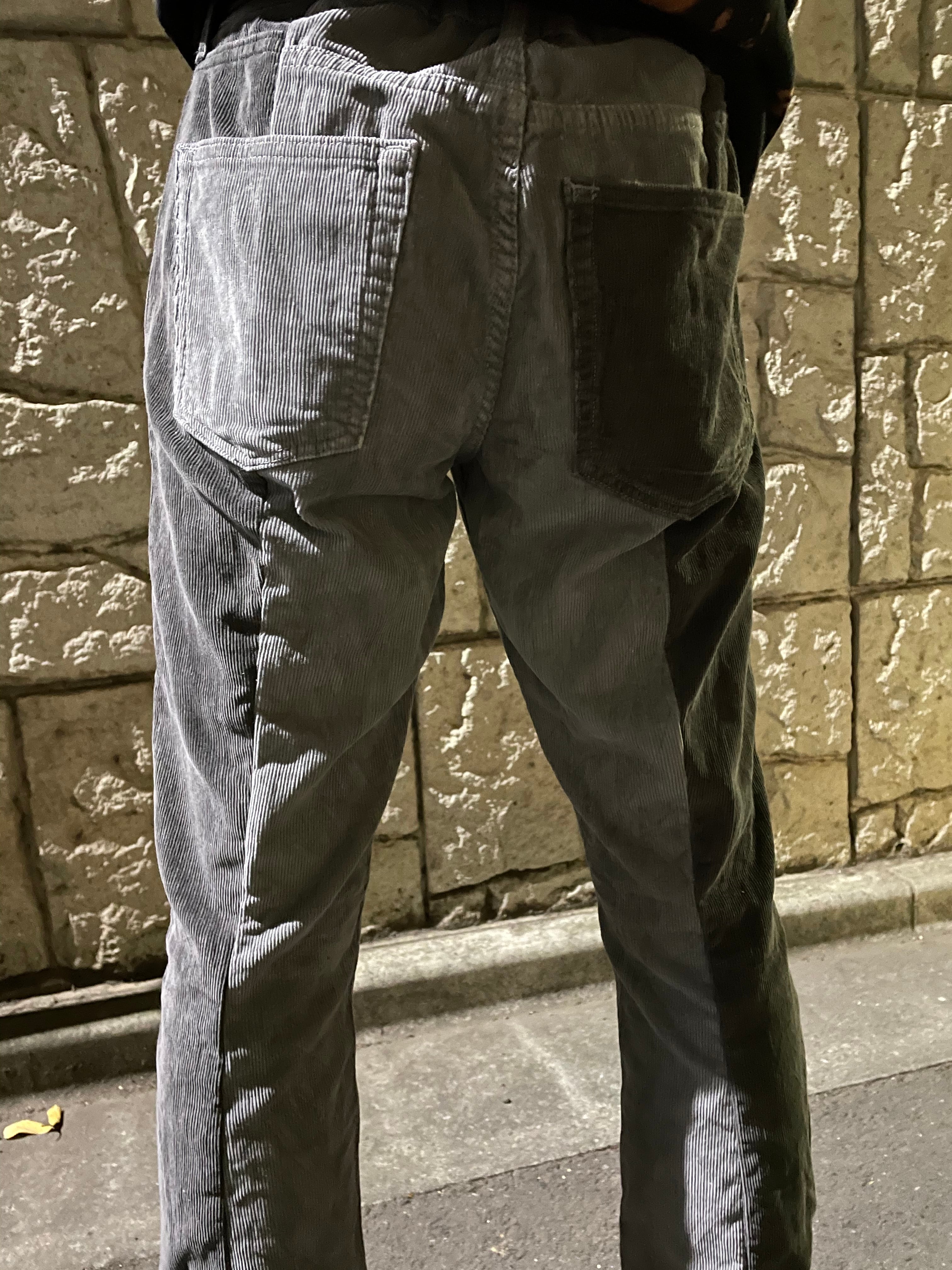 2色のコーデュロイパンツを組み合わせた1着。