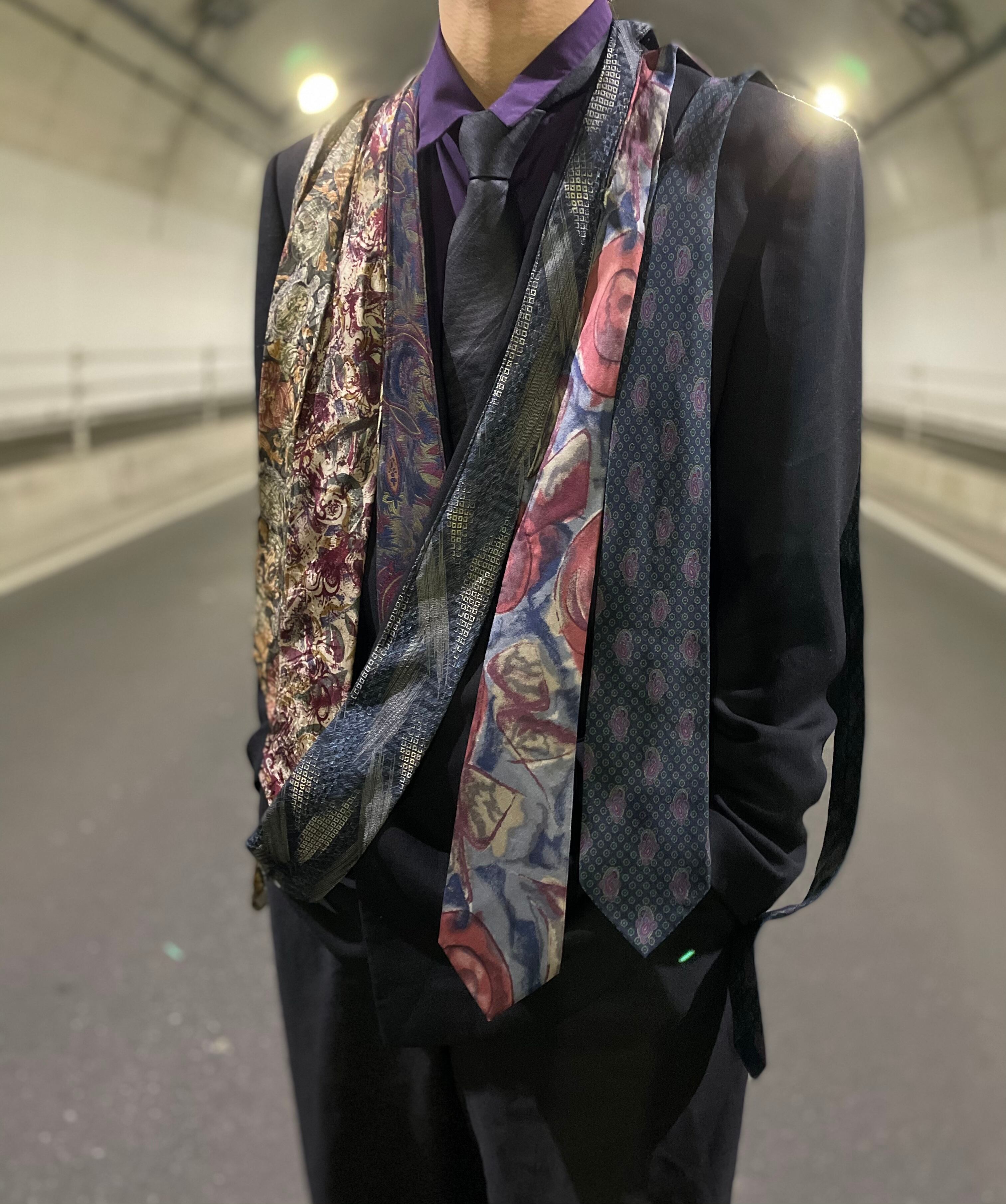 襟のラインに沿って6本のネクタイを使ったジャケットです。