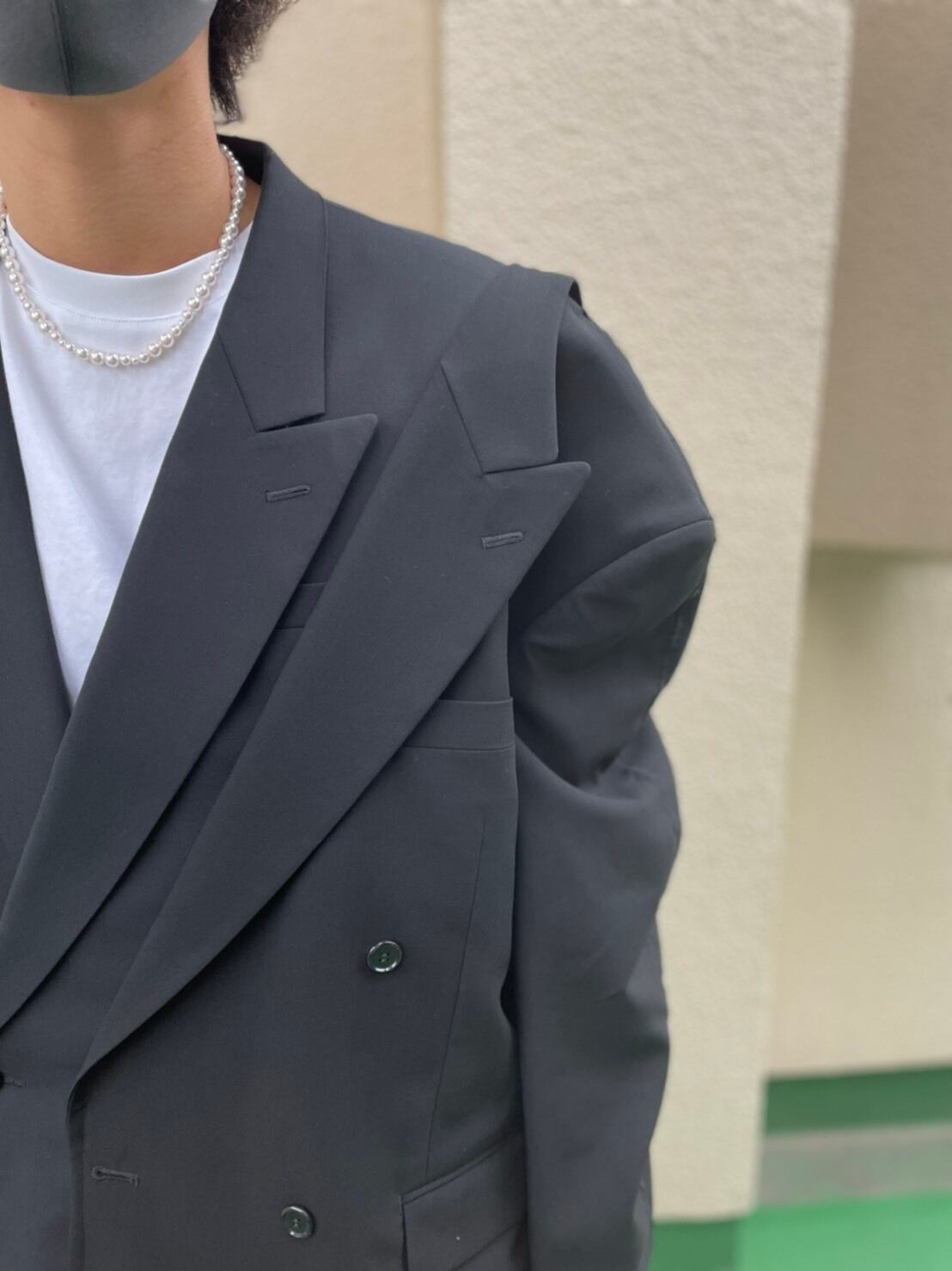 ジャケットの片側に、もう一つのジャケットがレイヤードされているデザイン。