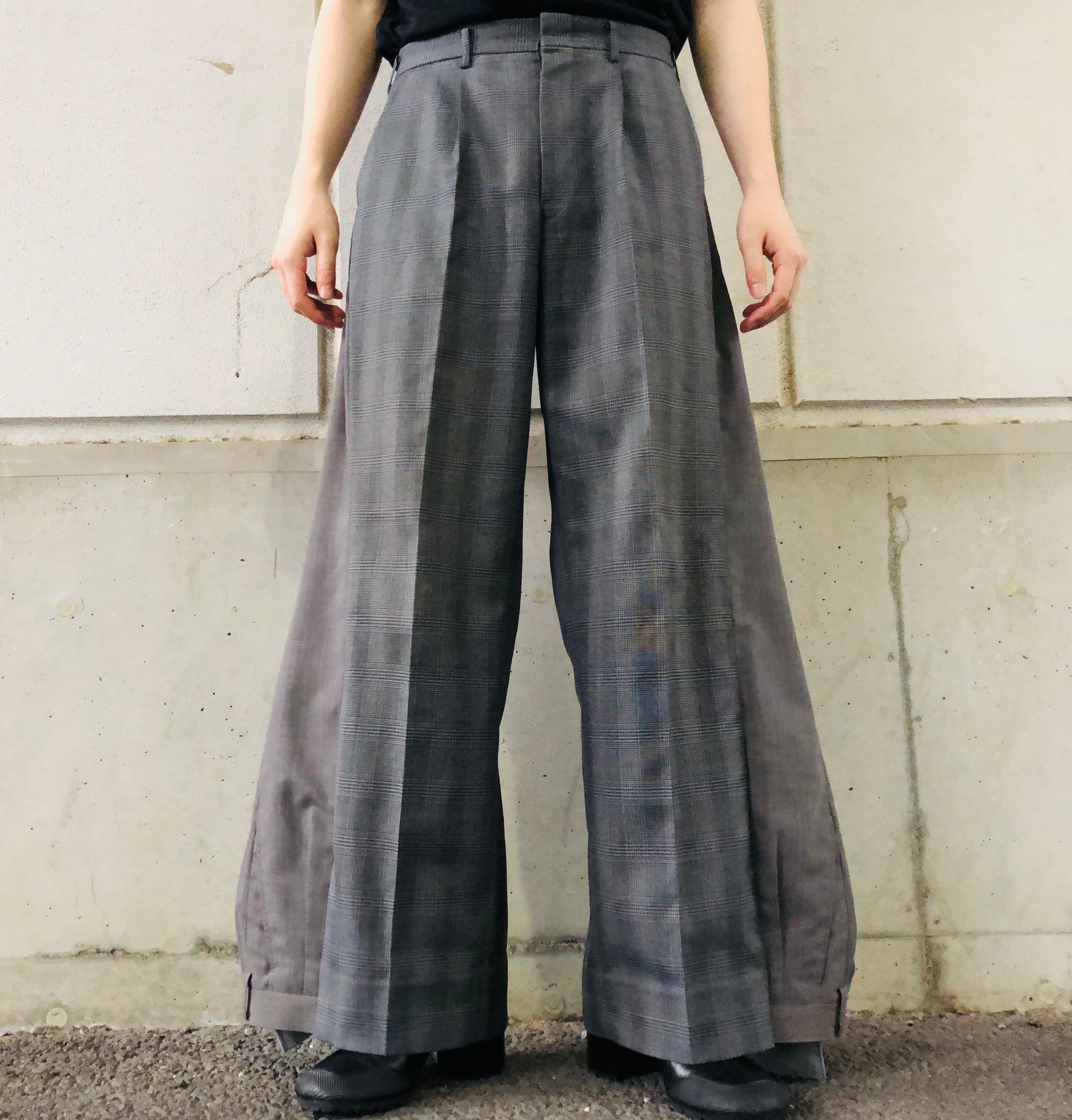 サイドに逆さまにしたスラックスをドッキングしたワイドパンツ。膝裏あたりに深めのタックを入れ裾にかけて広がるように仕立てています。