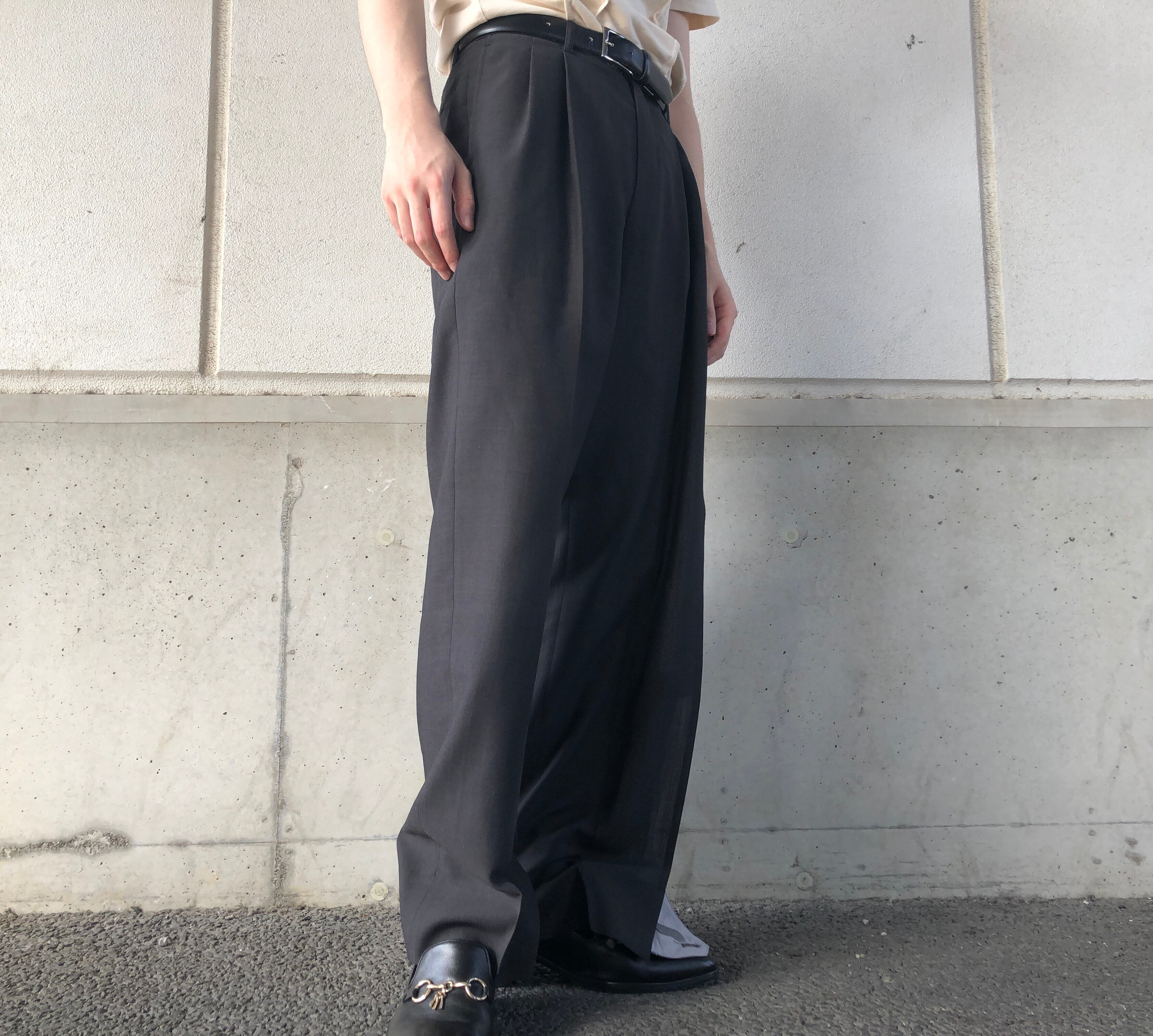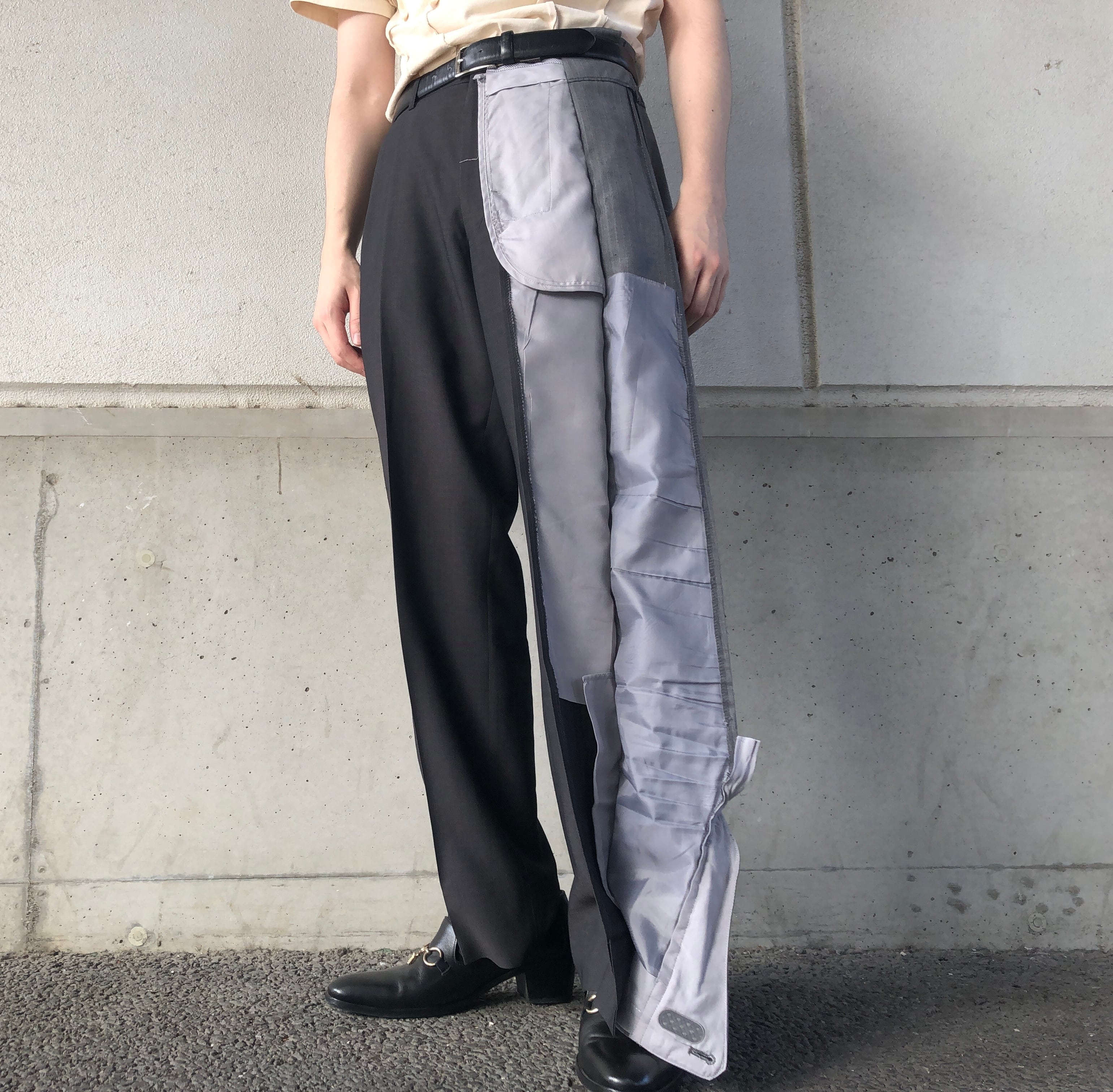片側にだけもう一本スラックスをドッキングしたパンツ。ベルトループの通し方で見せ方を変えることができる。