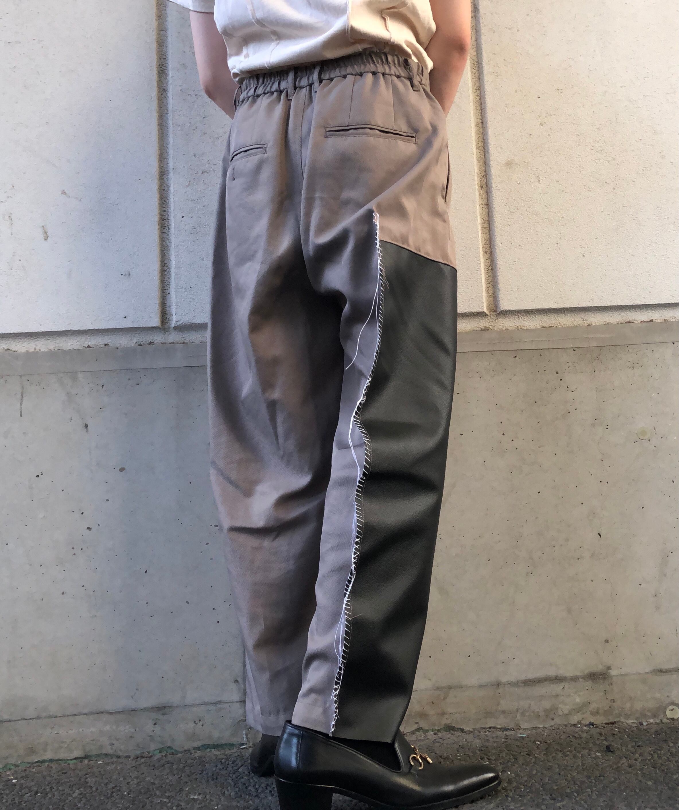 スラックスの片側にPVCレザーをドッキングし、ハンドステッチを施したパンツ。
