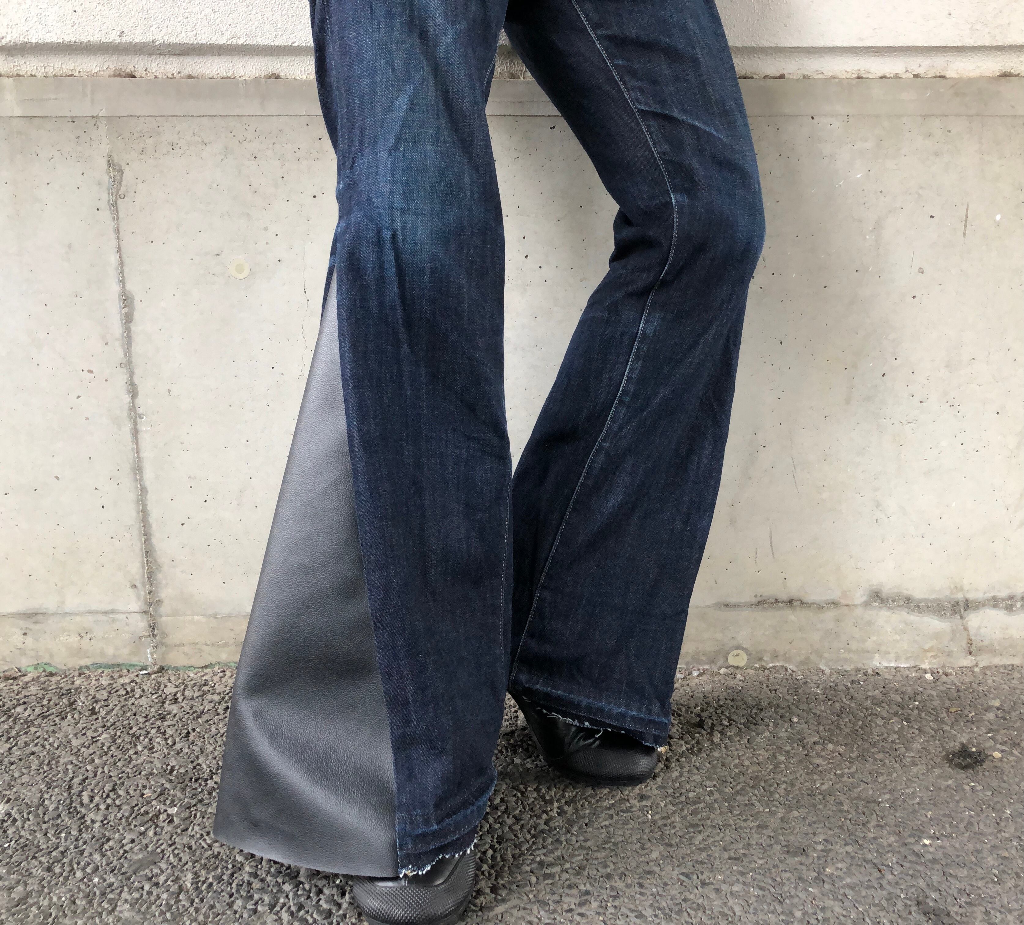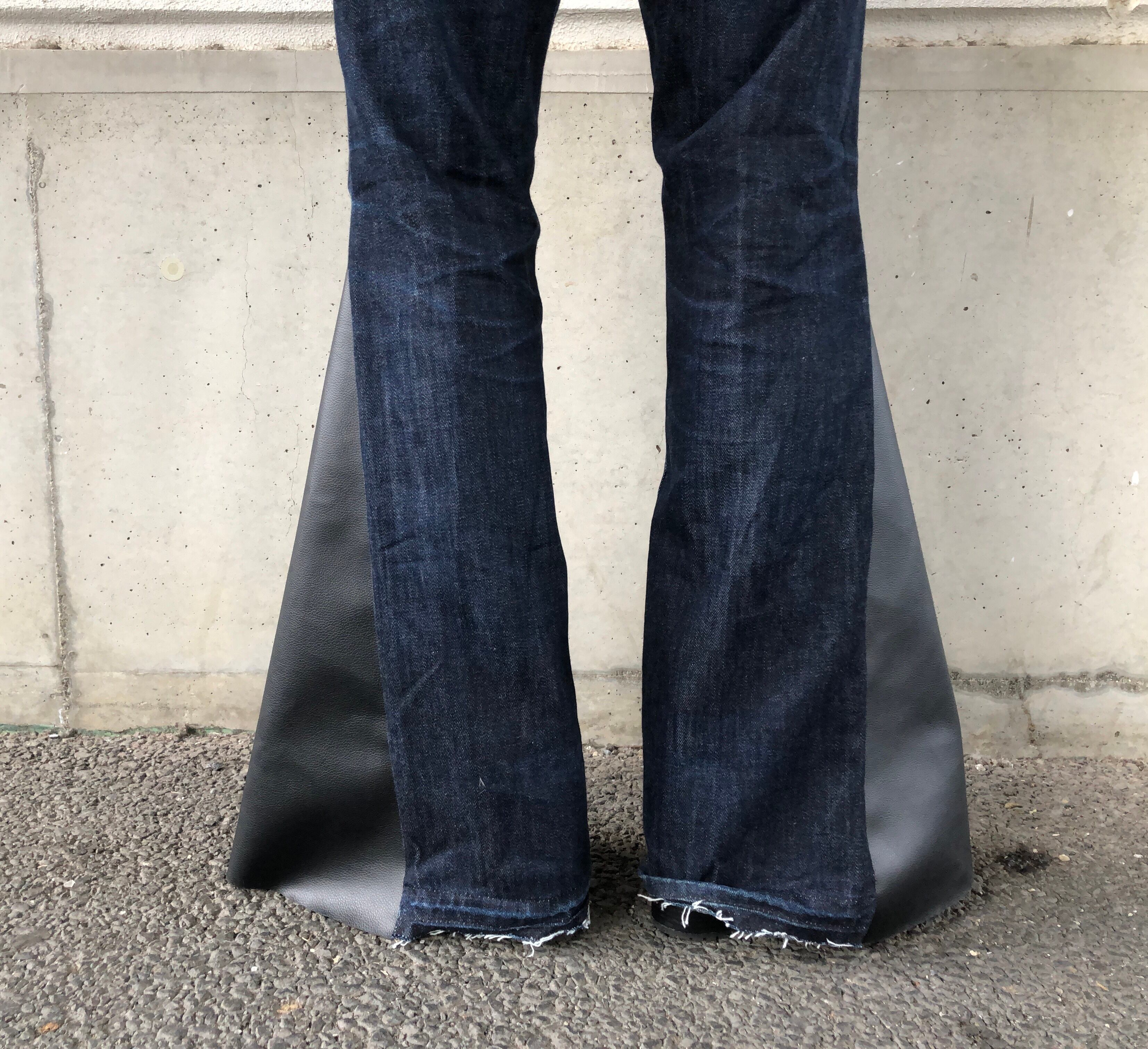 デニムパンツにPVCレザーの切り替えを加えたフレアパンツ。裾は縫い目をほどきカットオフにしています。