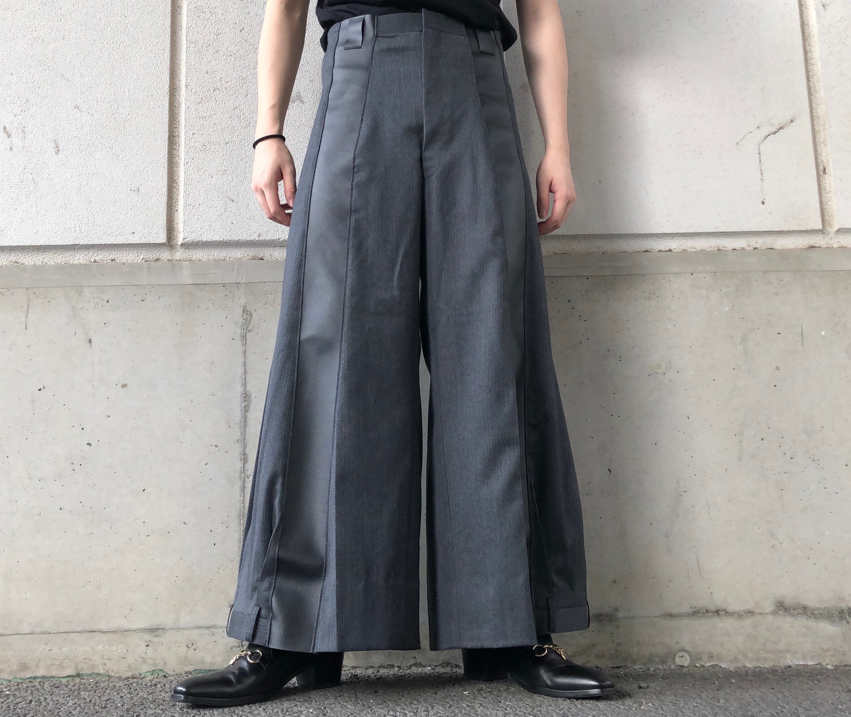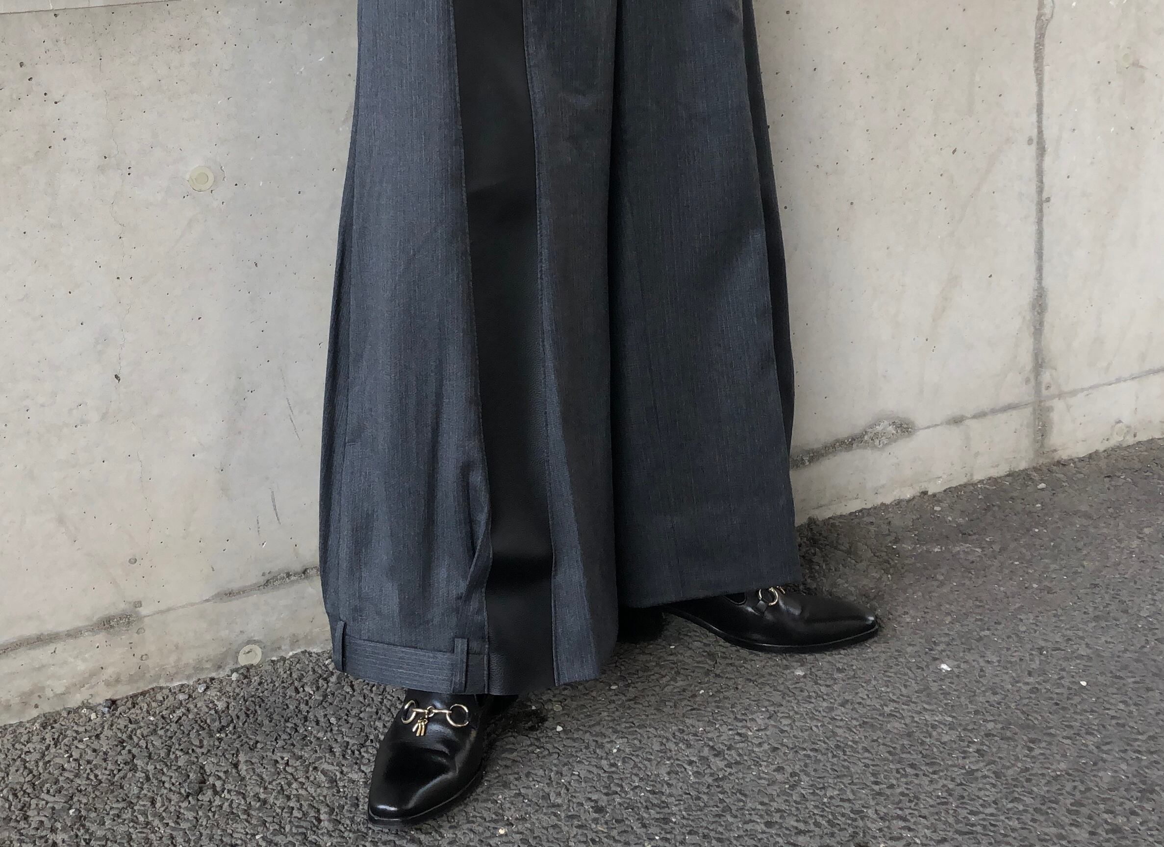 フロントとバックにPVCレザーの切り替えが入ったワイドフレアスラックス。
