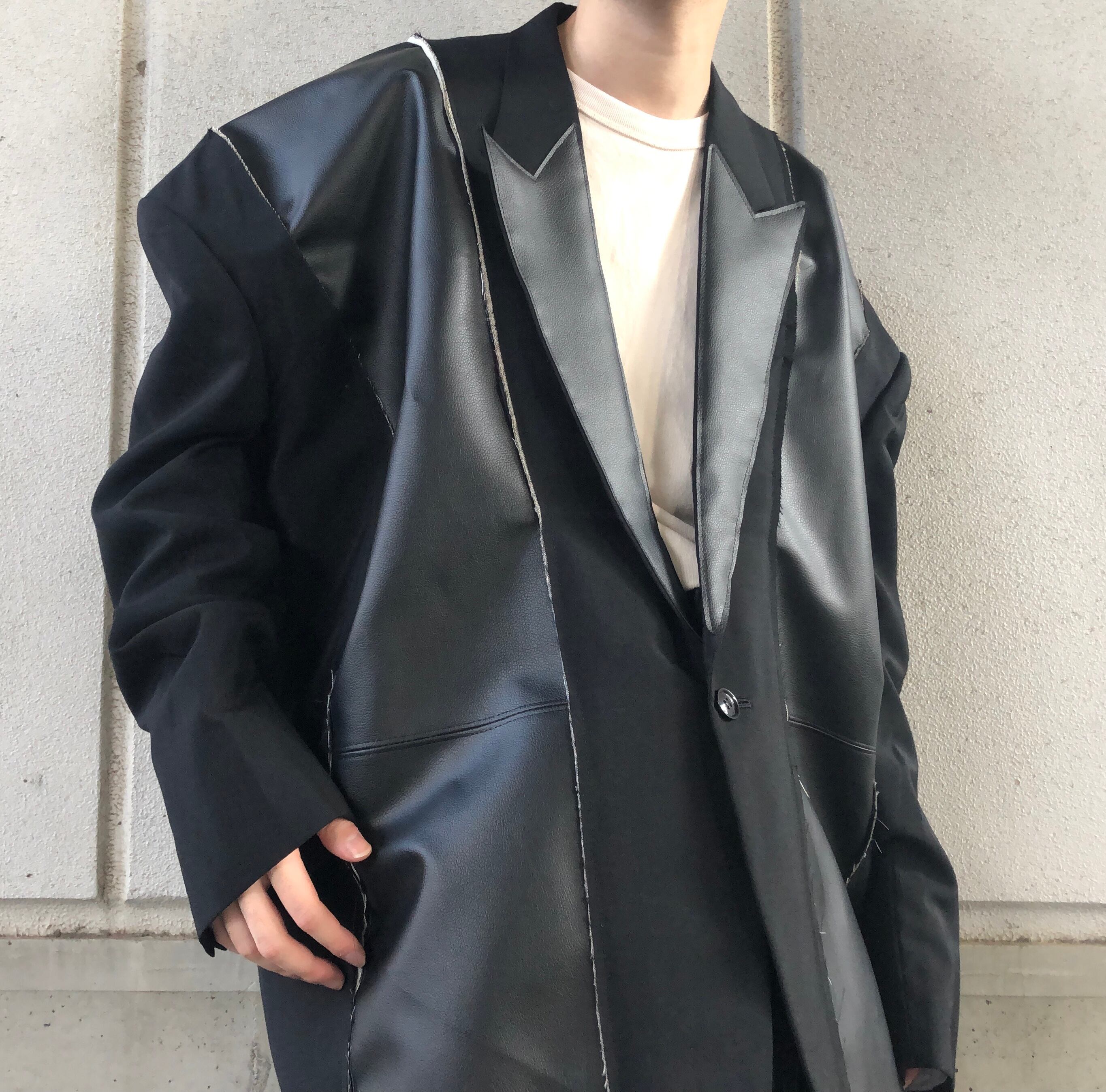 フロントとバック、ラペルにPVCレザーの切り替えが入ったテーラードジャケット。