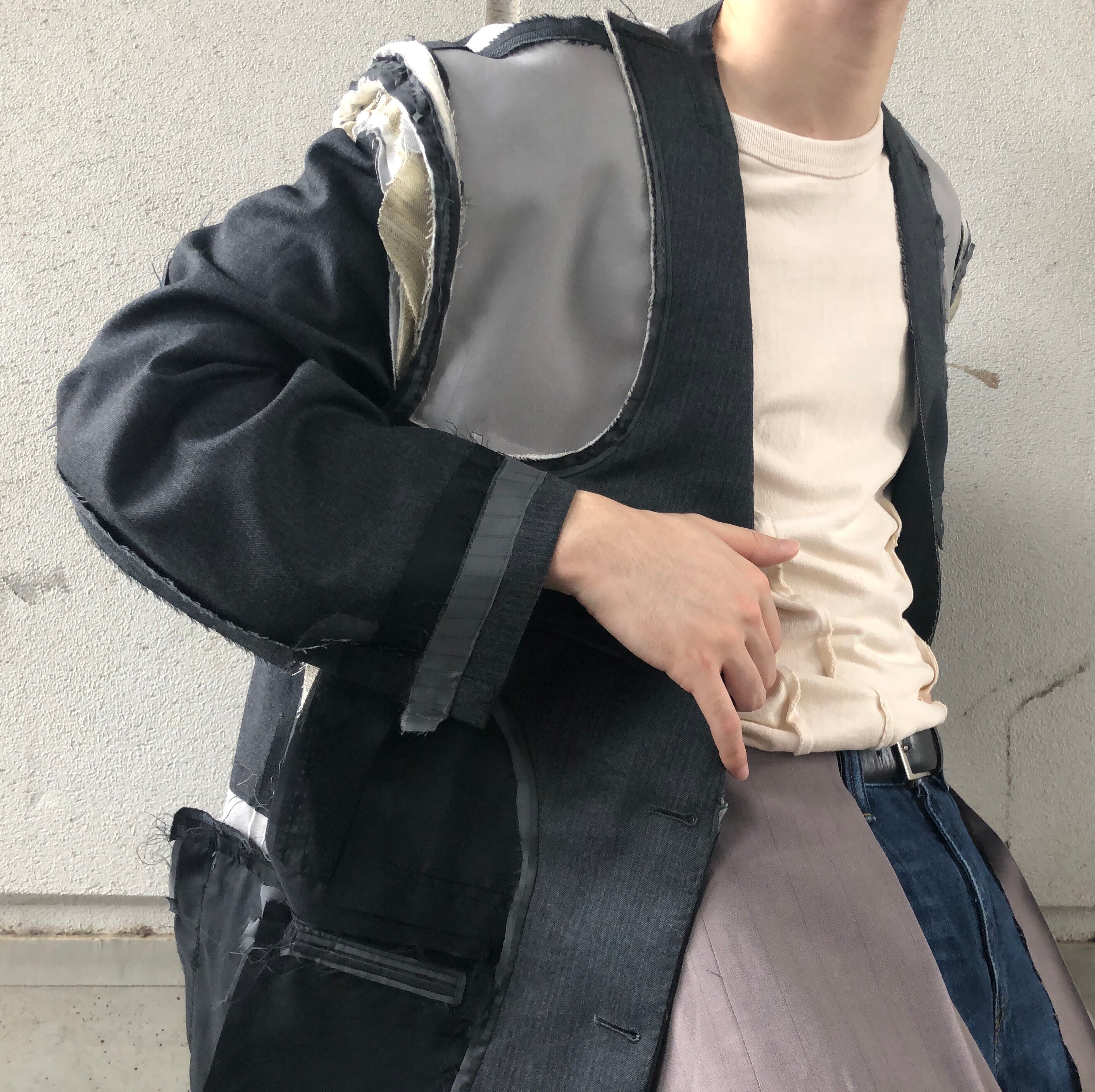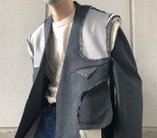 テーラードジャケットをインサイドアウトのノーカラージャケットに仕立て上げたアイテム。