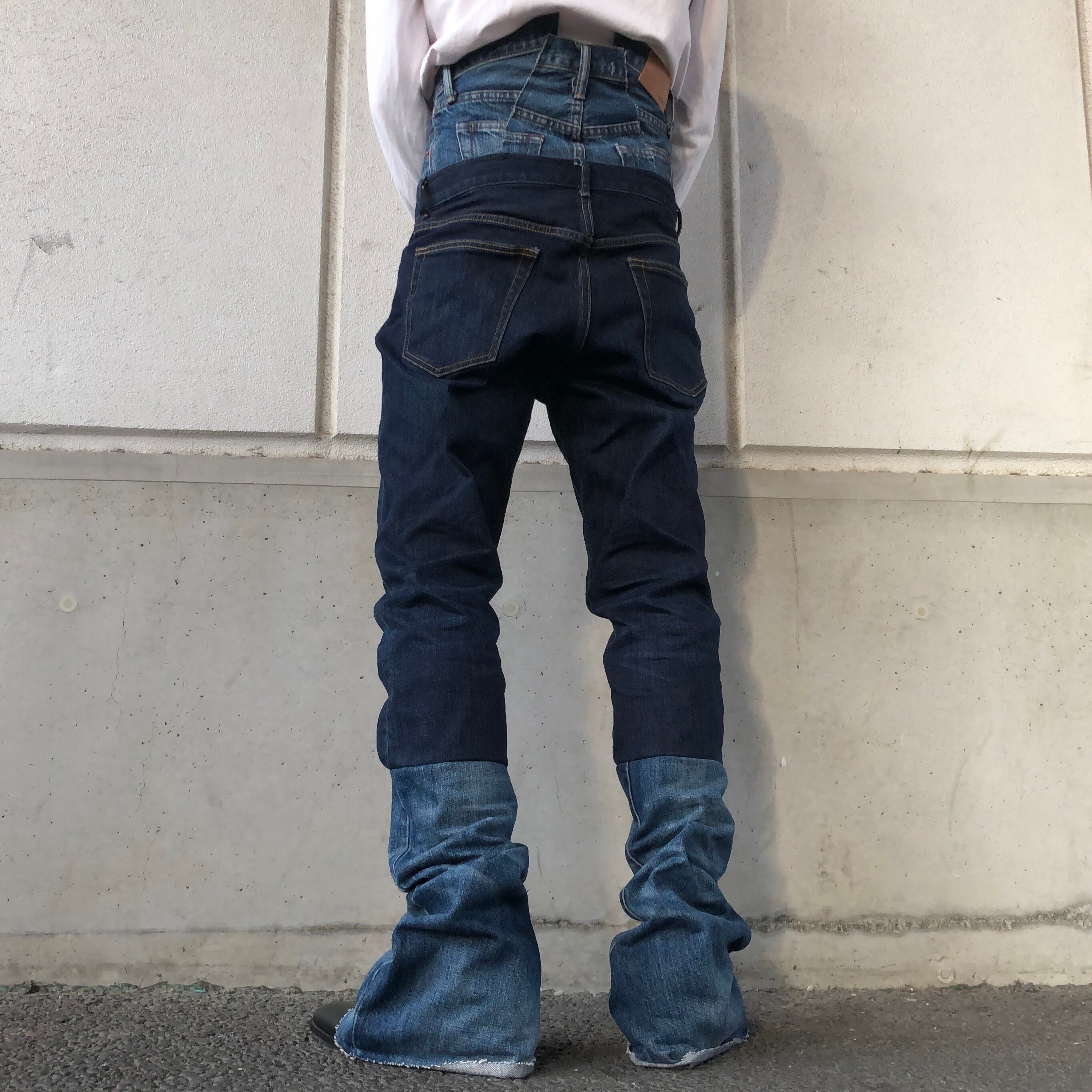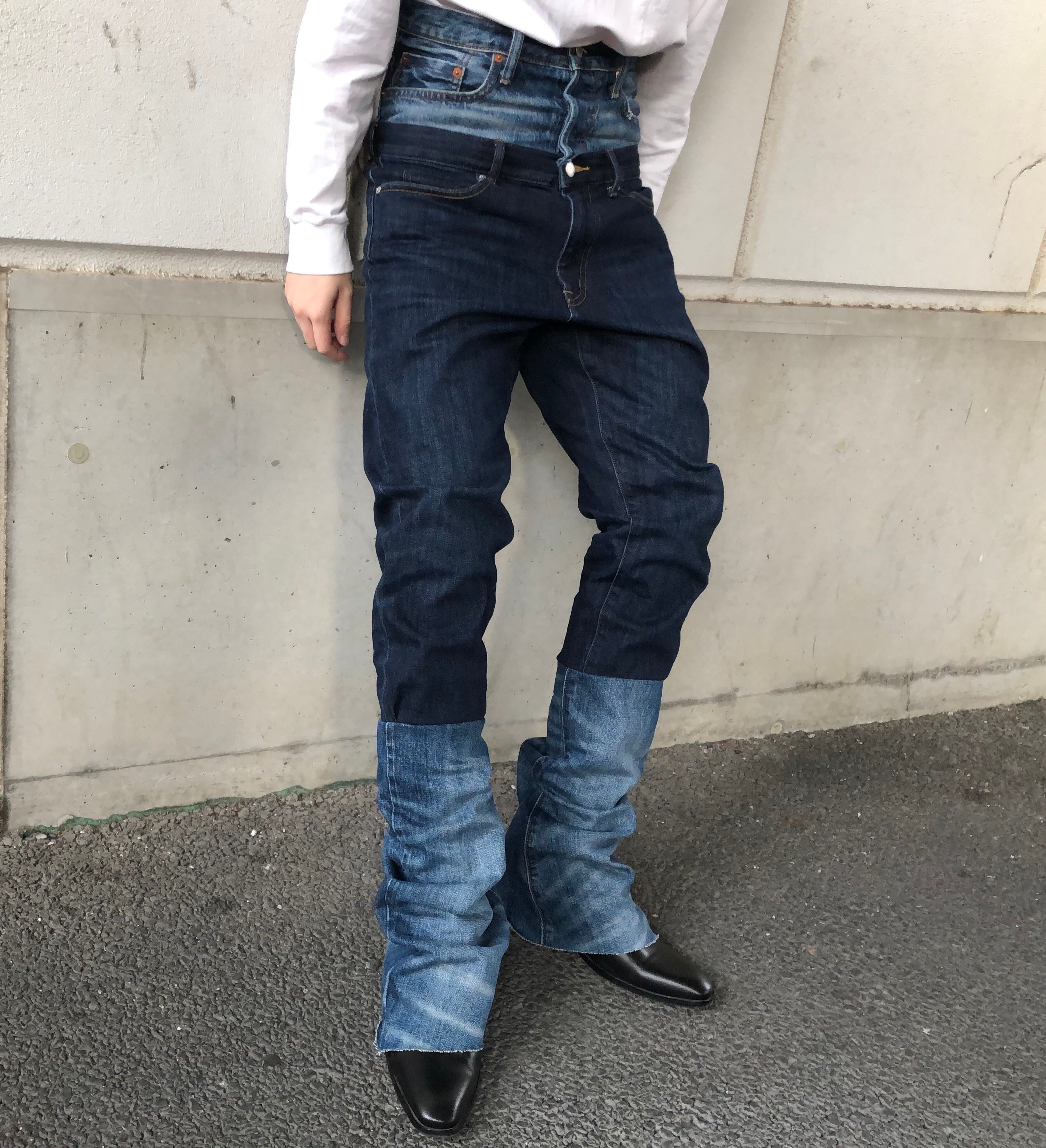 2本のデニムを組み合わせたロングパンツ。ダブルウエストにしている為かなりハイウエストで着用することができます。