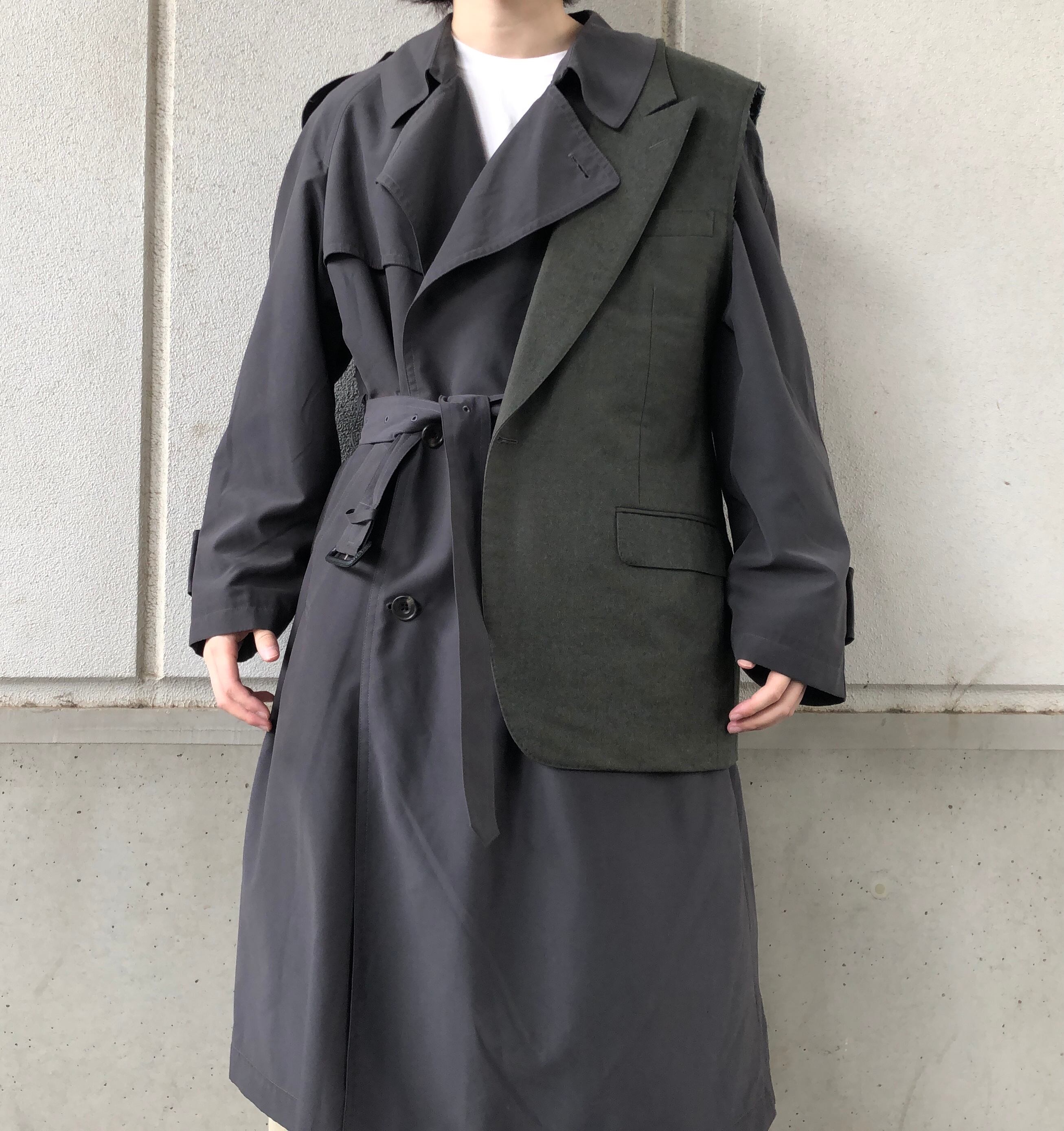 トレンチコートの片側に、テーラードベストがレイヤードされているデザイン。