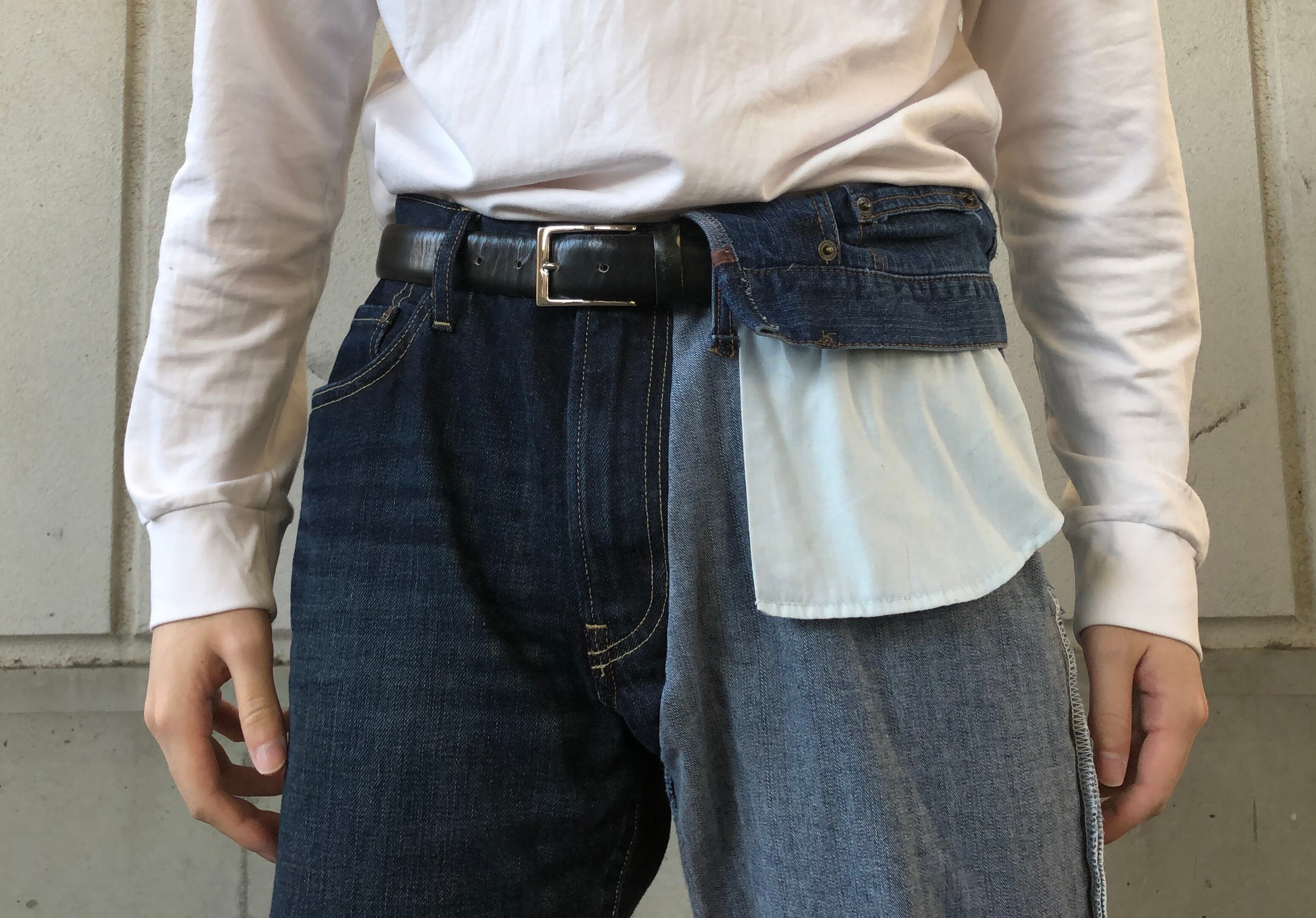 2本のパンツをドッキングし、片側がインサイドアウトになっているパンツ。