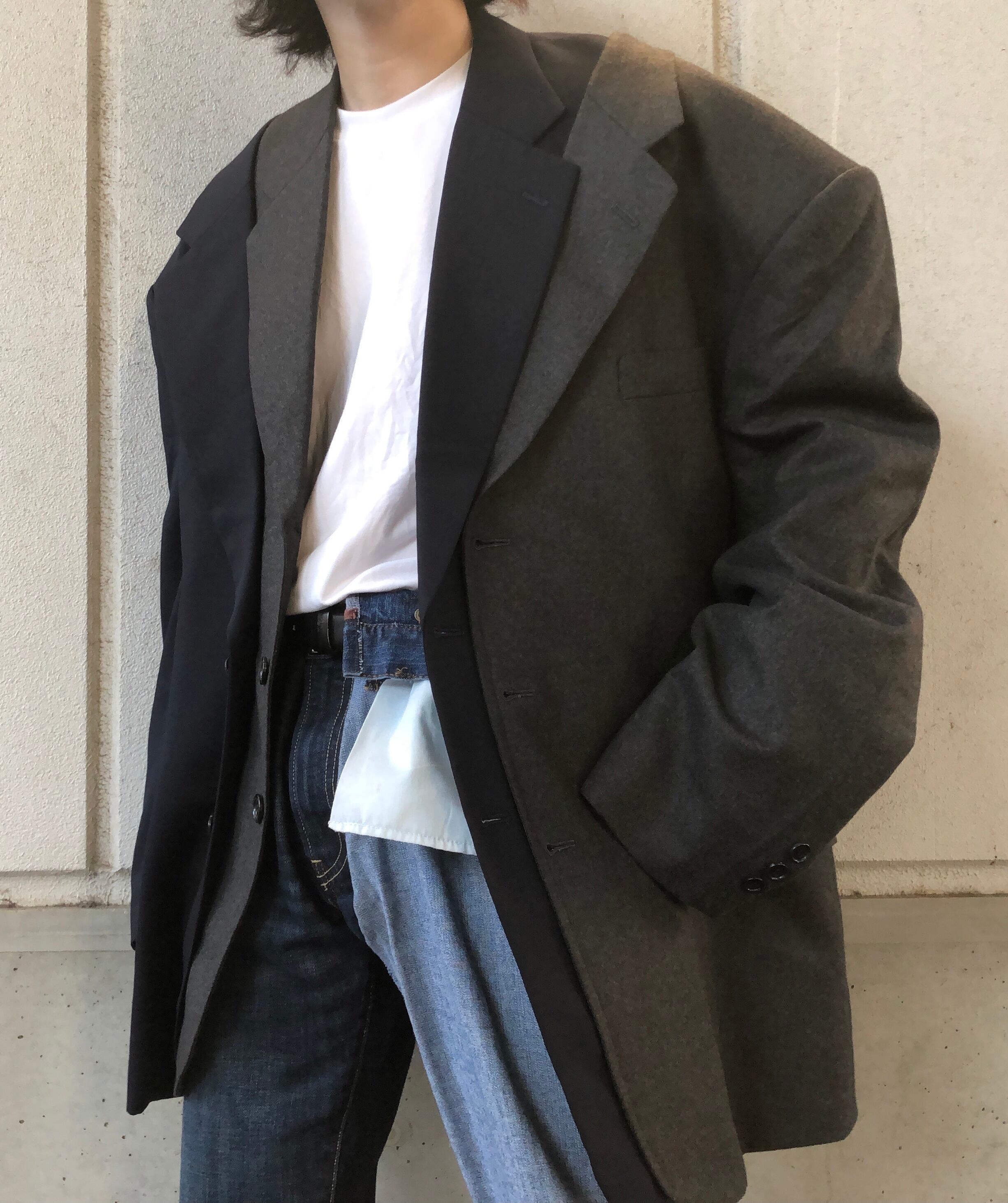 色味の異なるテーラードジャケットを両側に重ねたジャケット。