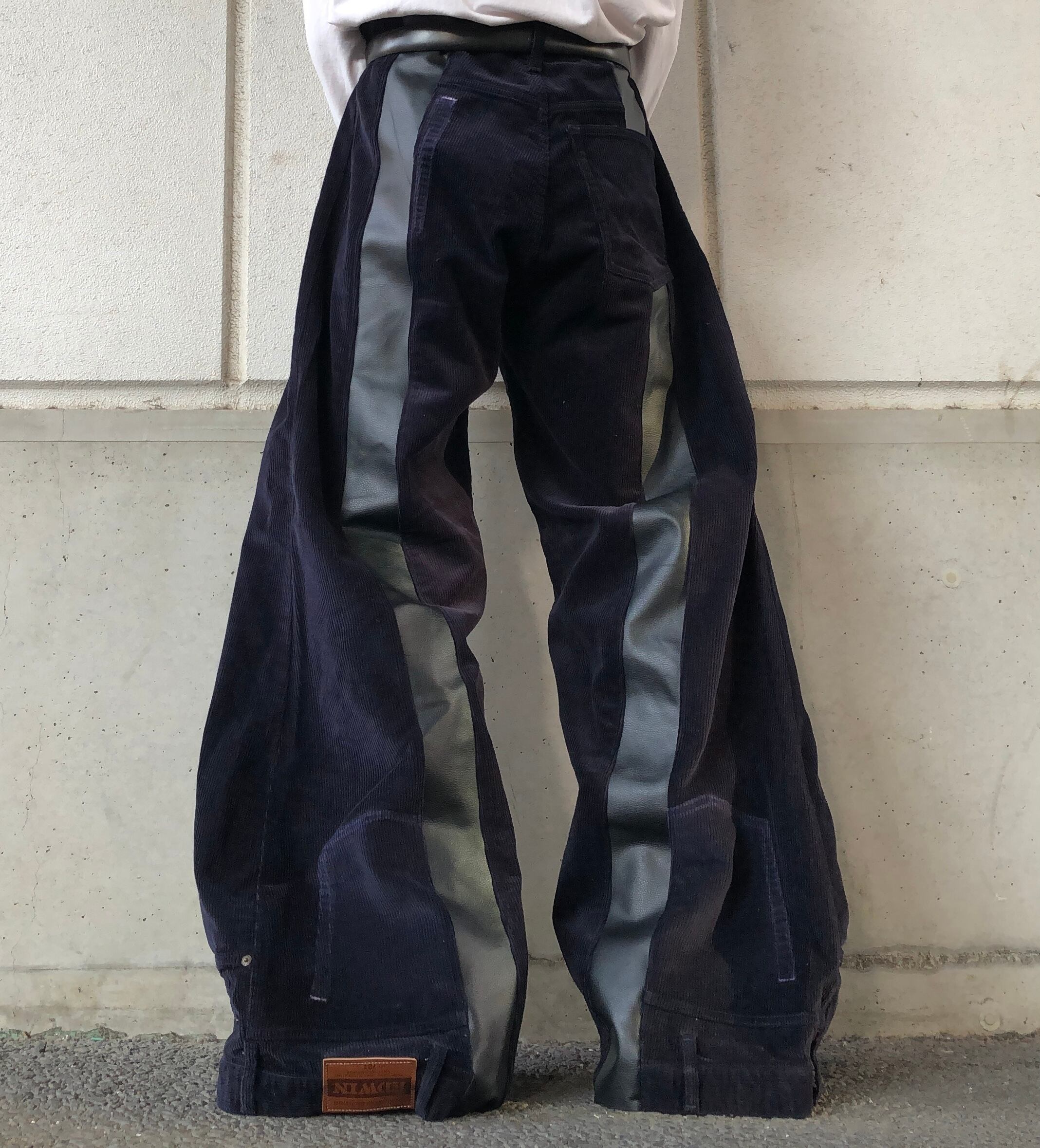 フロントとバックにPVCレザーの切り替えが入ったワイドフレアパンツ。