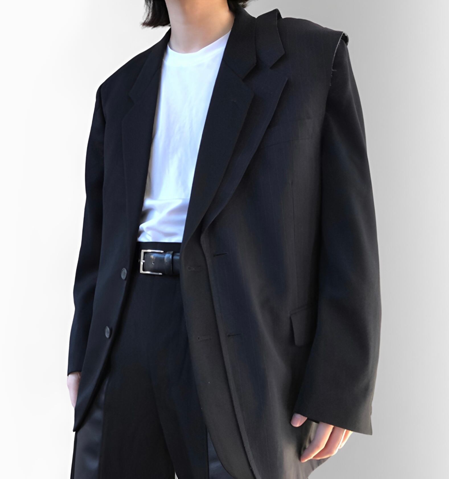 ジャケットの片側に、テーラードベストがレイヤードされているデザイン。