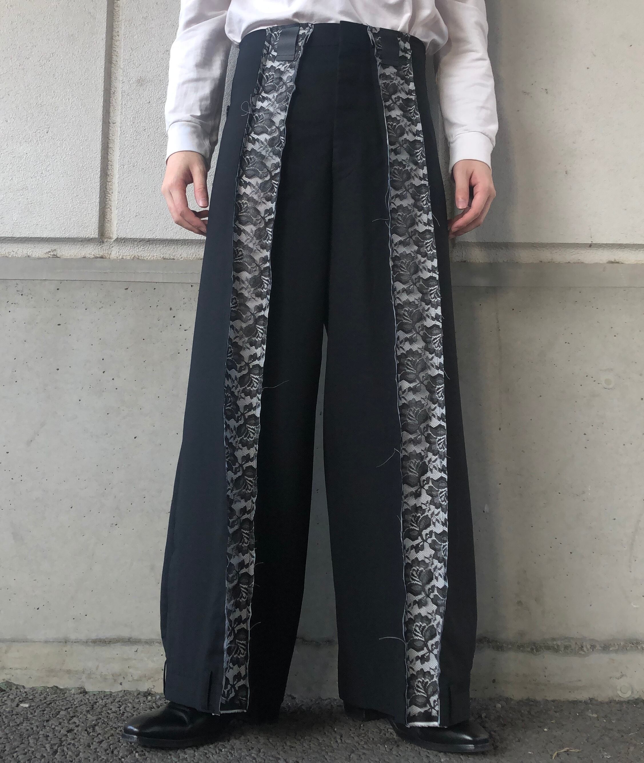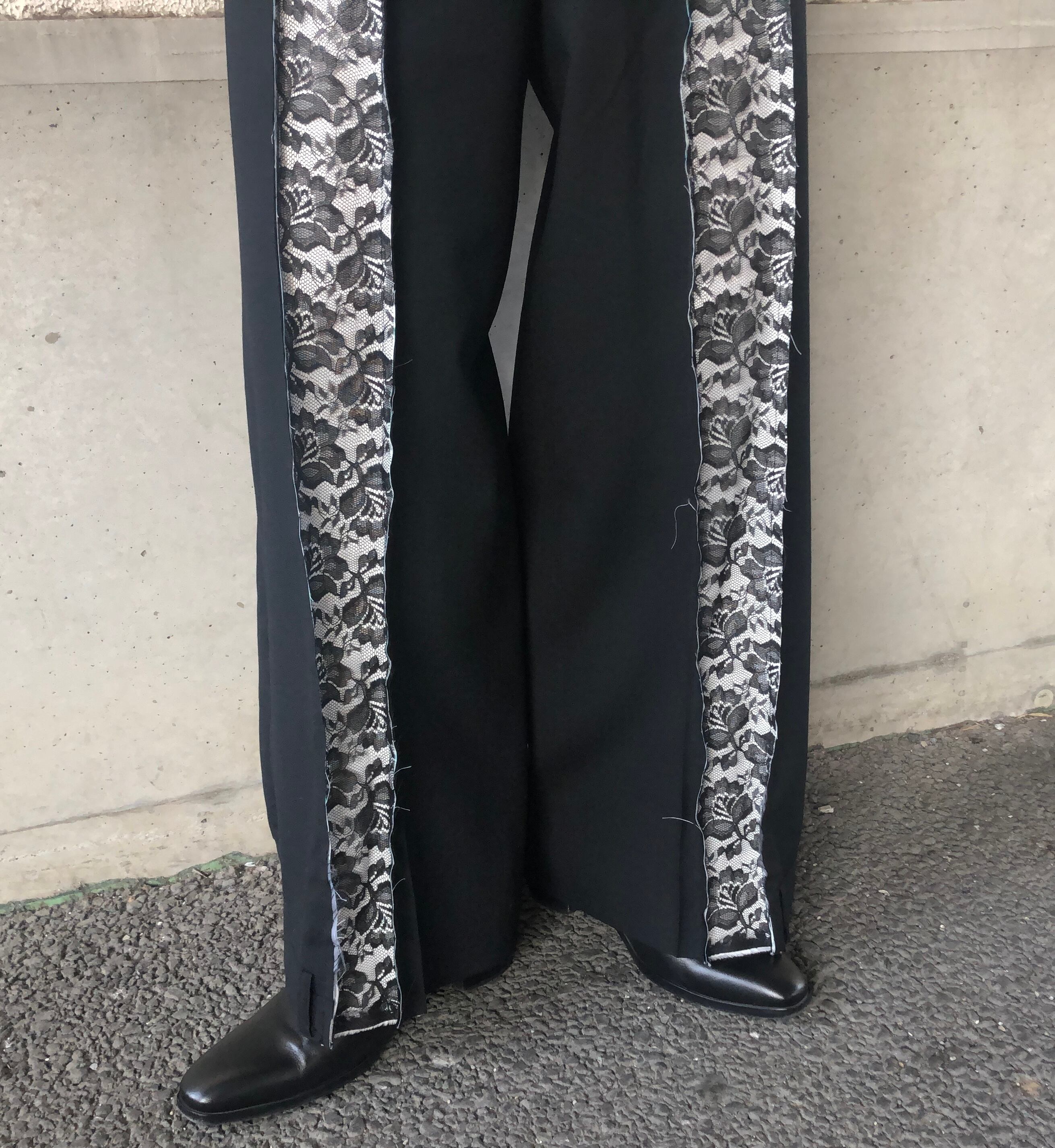 フロントとバックにレースの切り替えが入ったワイドフレアスラックス。