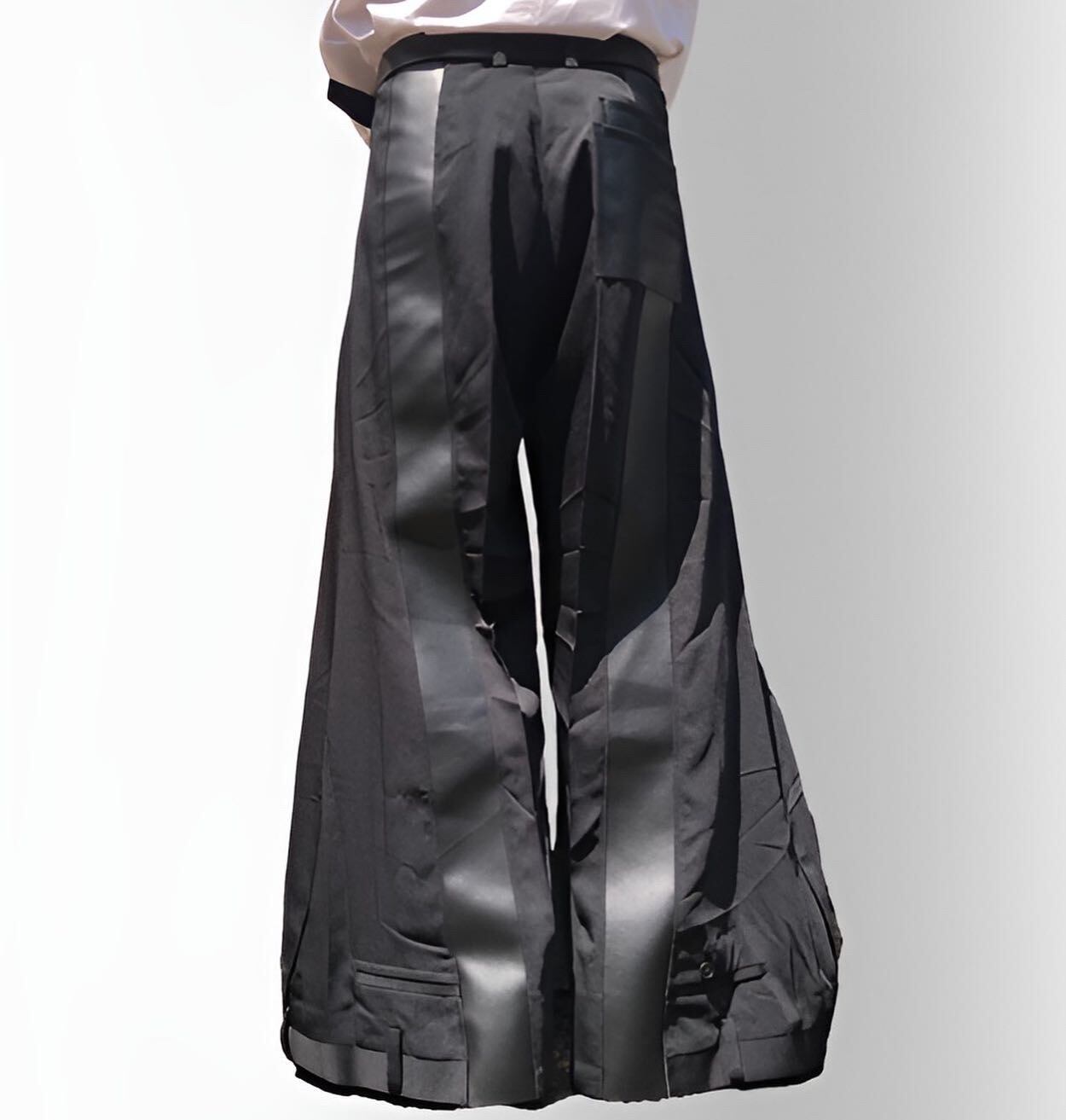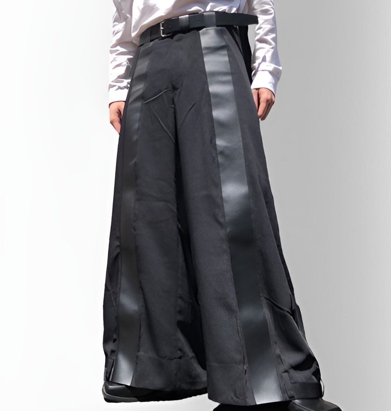 フロントとバックにPVCレザーの切り替えが入ったワイドフレアスラックス。