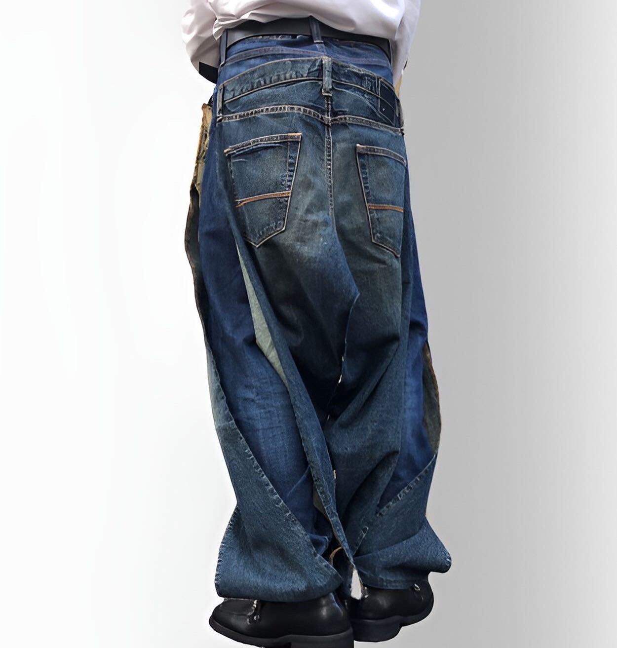 2本のデニムを撚りを加えてドッキングしたパンツ。