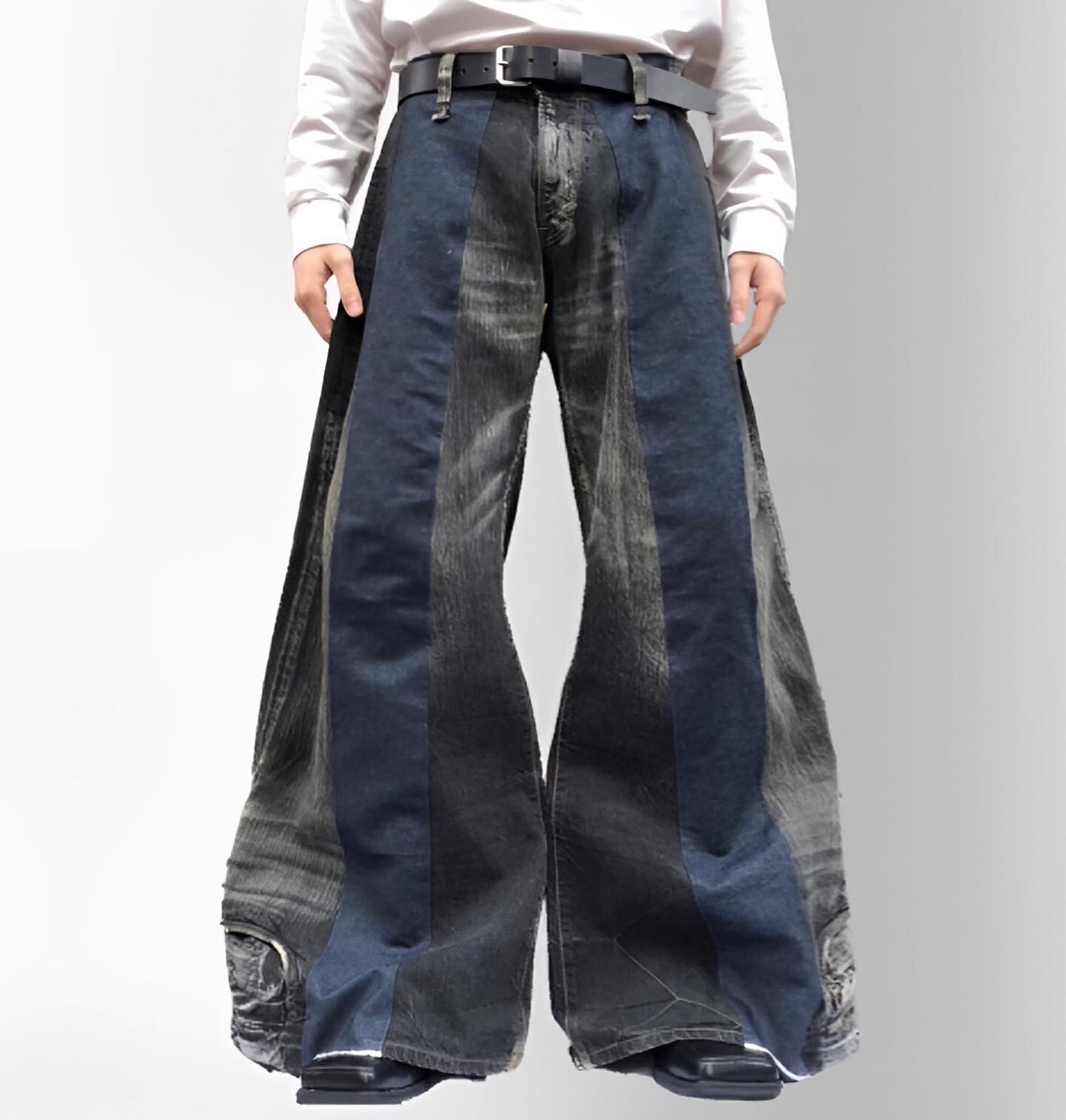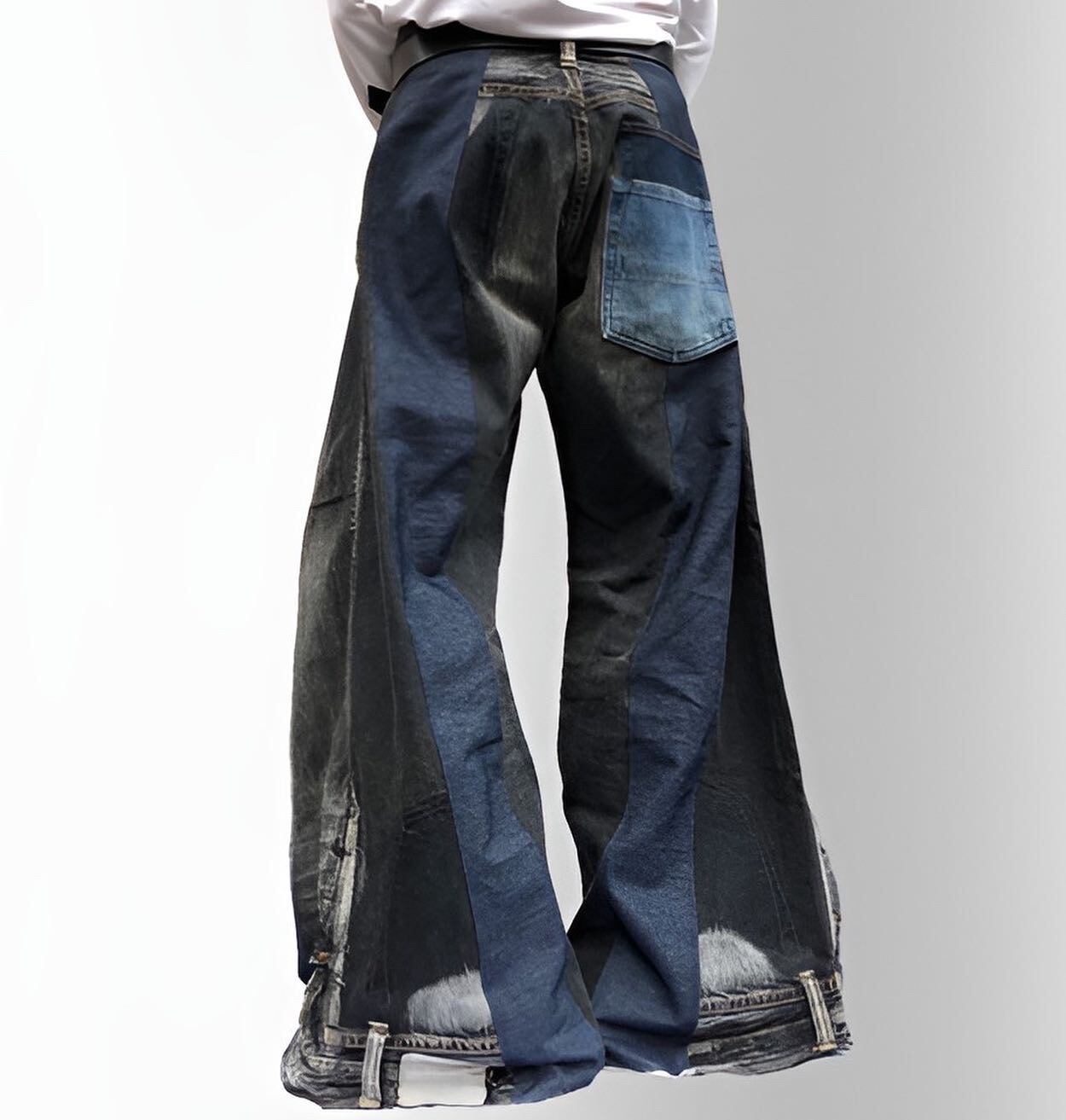 フロントとバックに色味の異なるデニム生地の切り替えが入ったワイドフレアデニム。