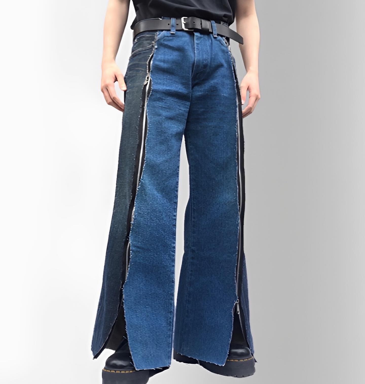 2色のデニムをドッキングさせたワイドフレアパンツ。ファスナーを開けることでよりフレアなシルエットになります。