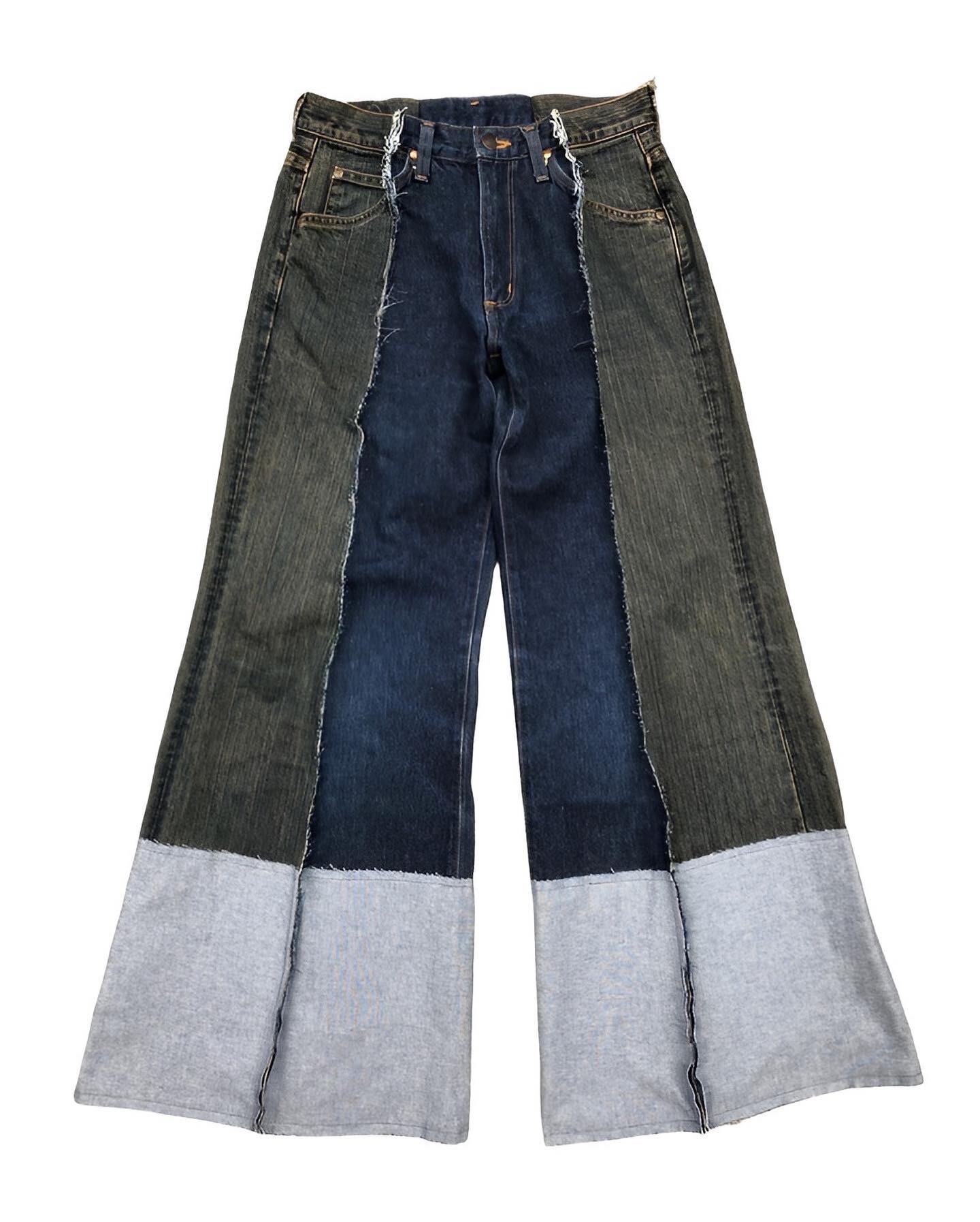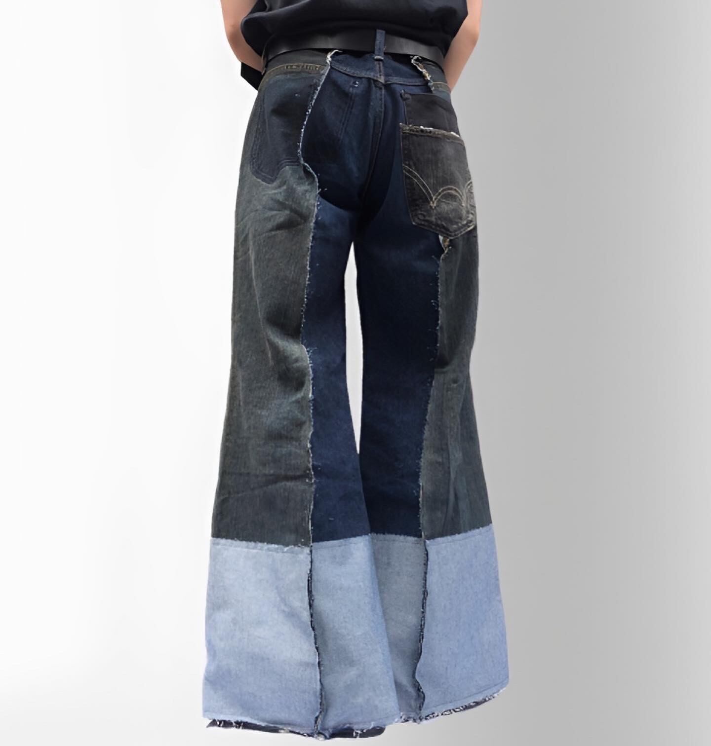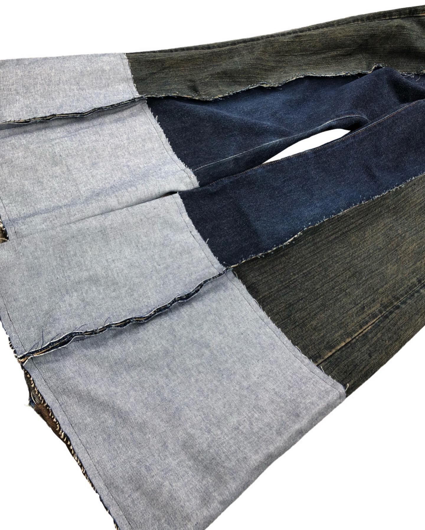 2色のデニムをドッキングさせたワイドフレアパンツ。