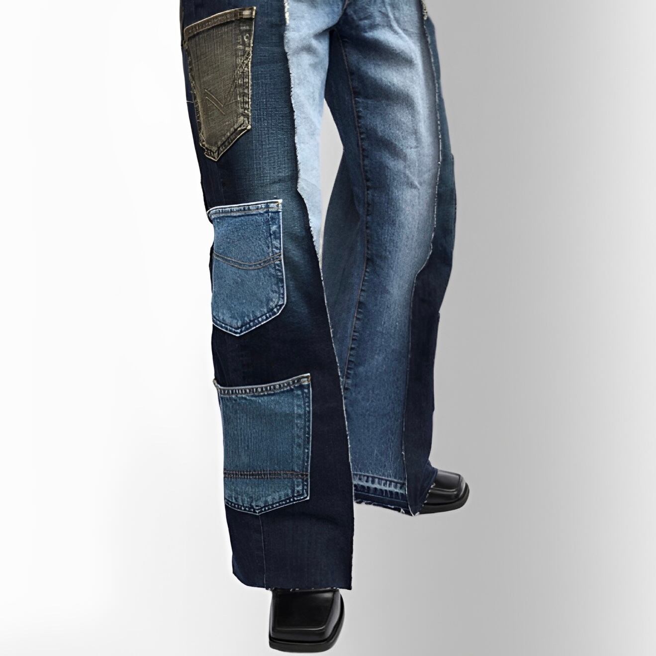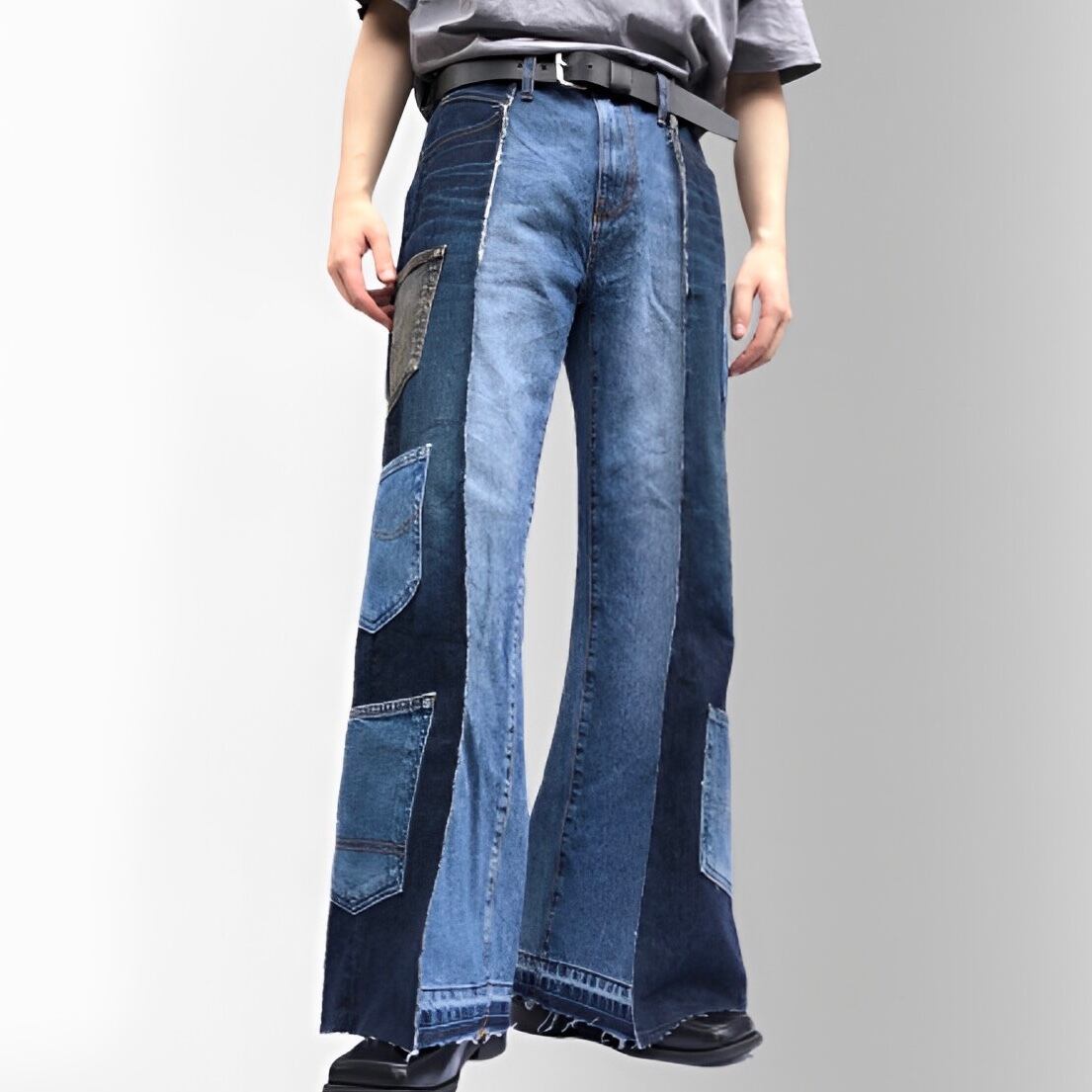2色のデニムをドッキングさせたワイドフレアパンツの両サイドに様々なブランドのポケットをつけたアイテム。