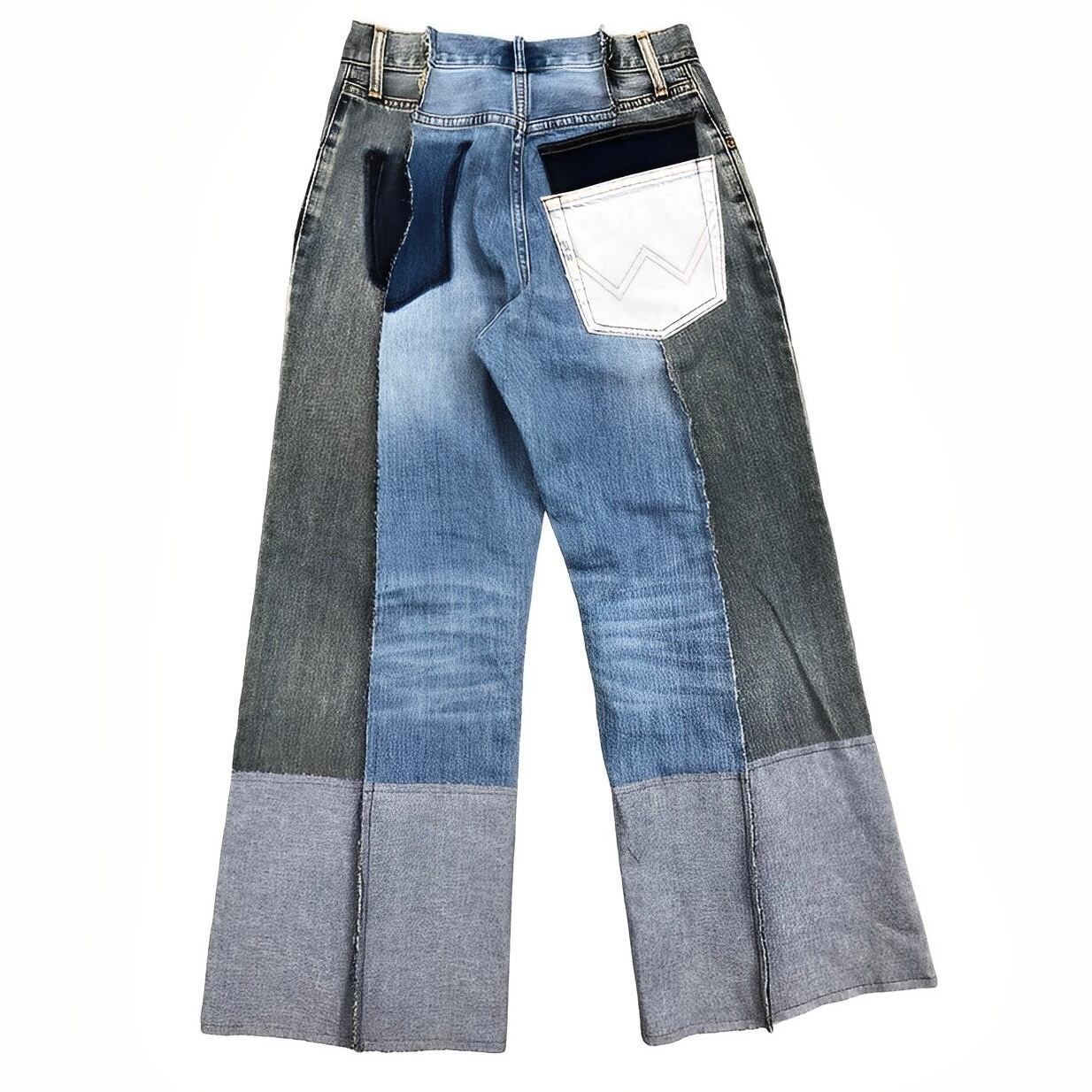 2色のデニムをドッキングさせたワイドフレアパンツ。裾をロールアップしているかの様に見える別生地が縫い合わされています。