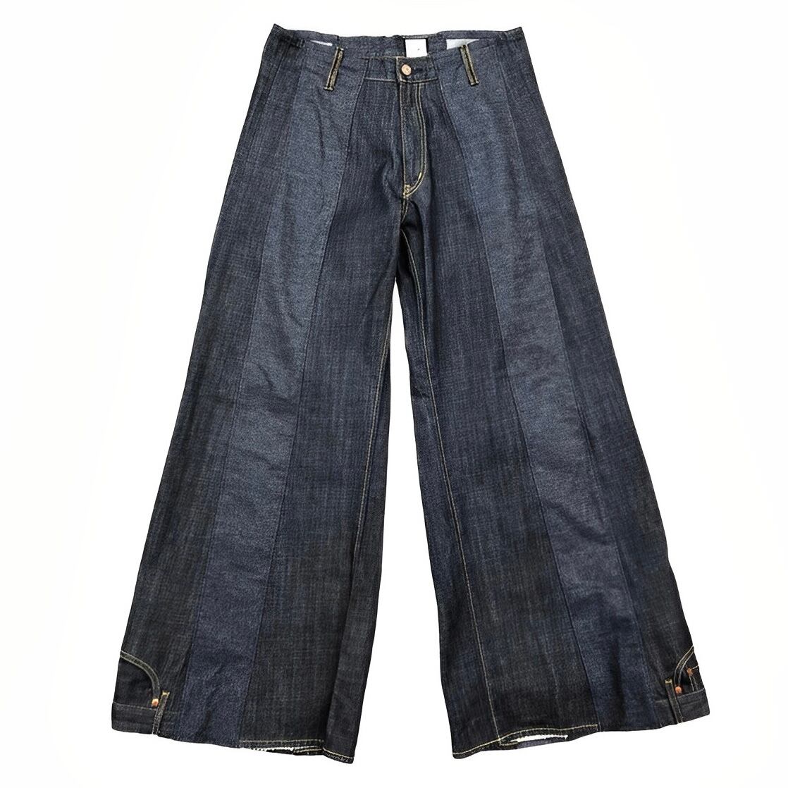 フロントとバックに色味の異なるデニム生地の切り替えが入ったワイドフレアデニム。