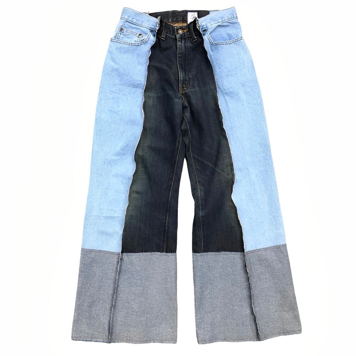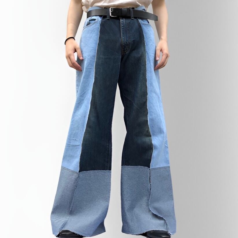 2色のデニムをドッキングさせたワイドフレアパンツ。裾をロールアップしているかの様に見える別生地が縫い合わされています。