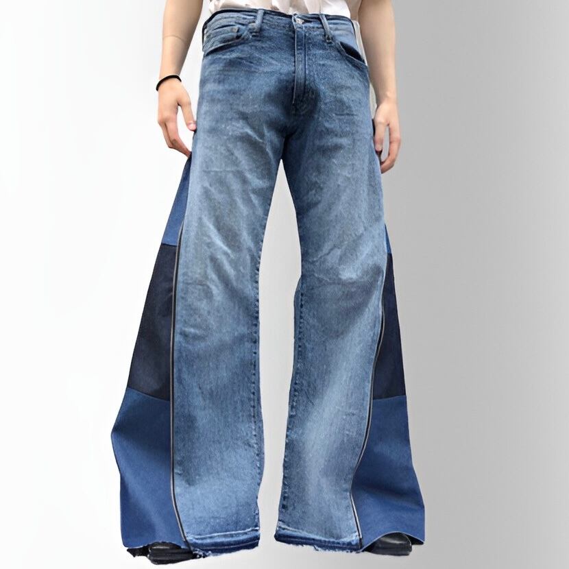 サイドにファスナーを取り付けたデニムパンツ。
