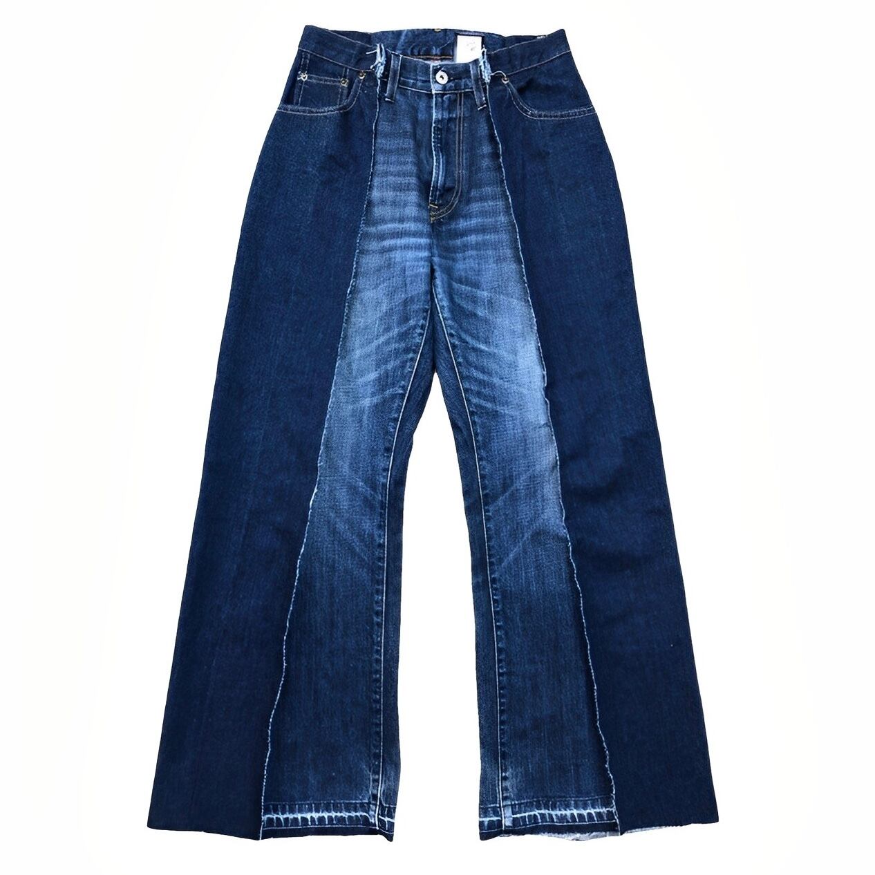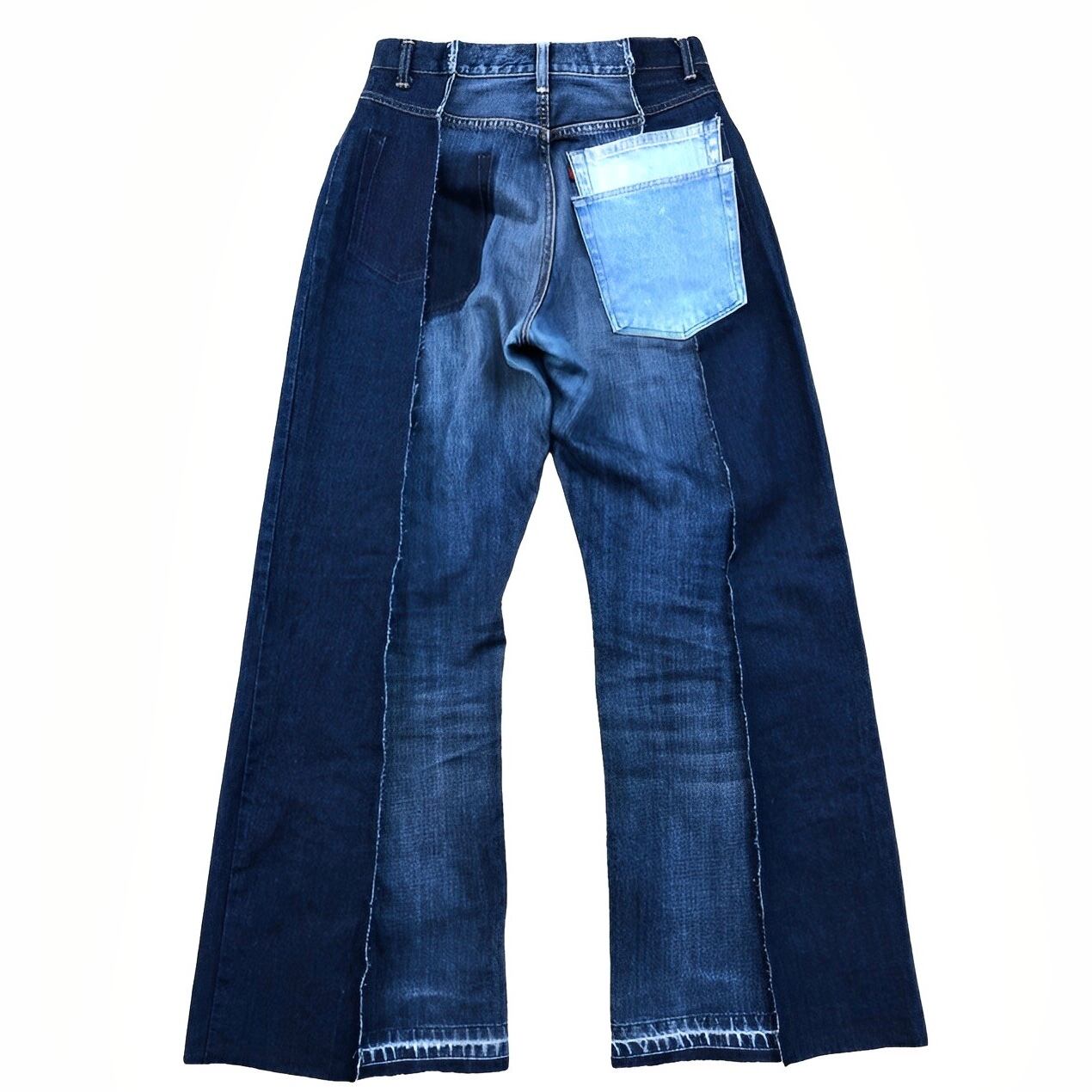 2色のデニムをドッキングさせたワイドフレアパンツ。