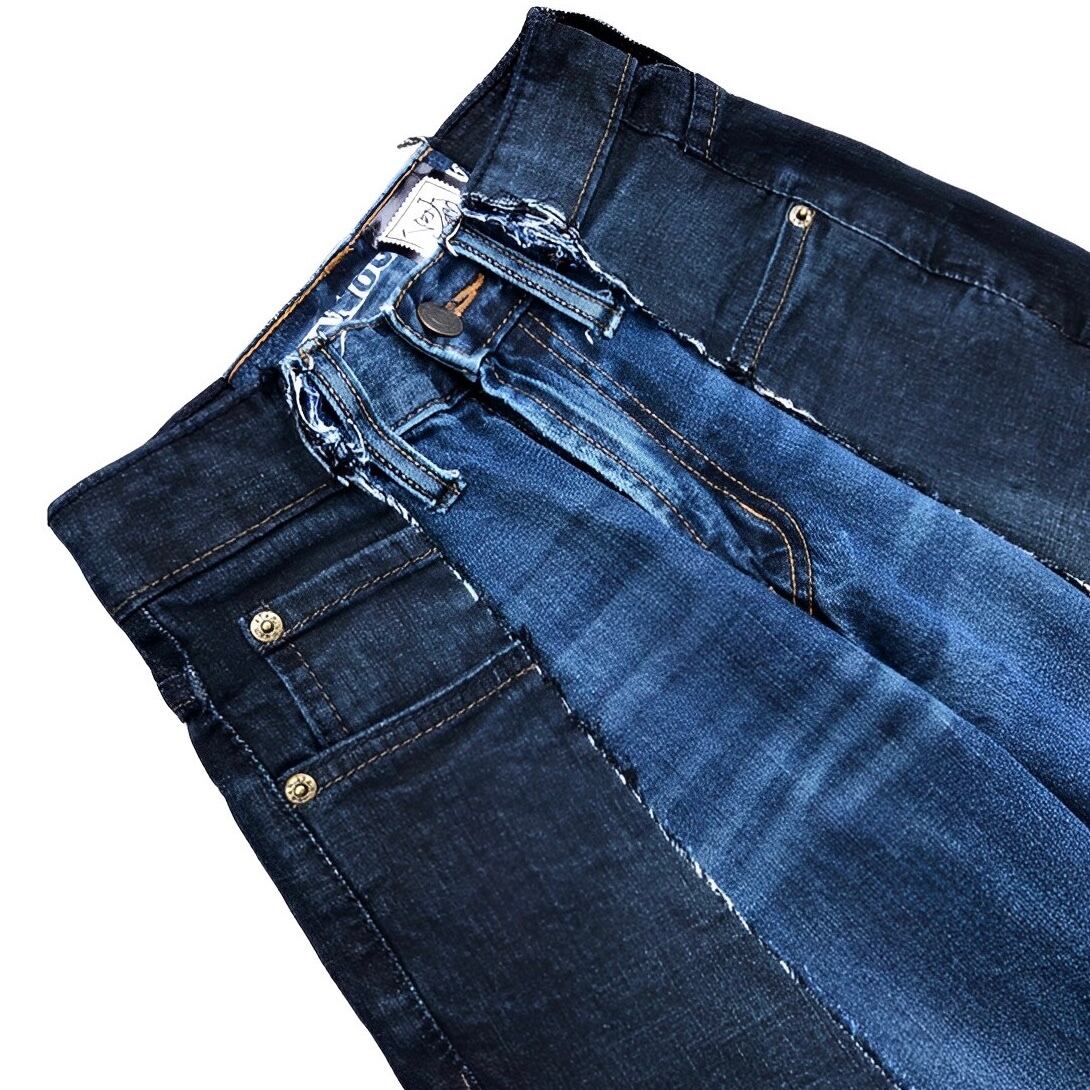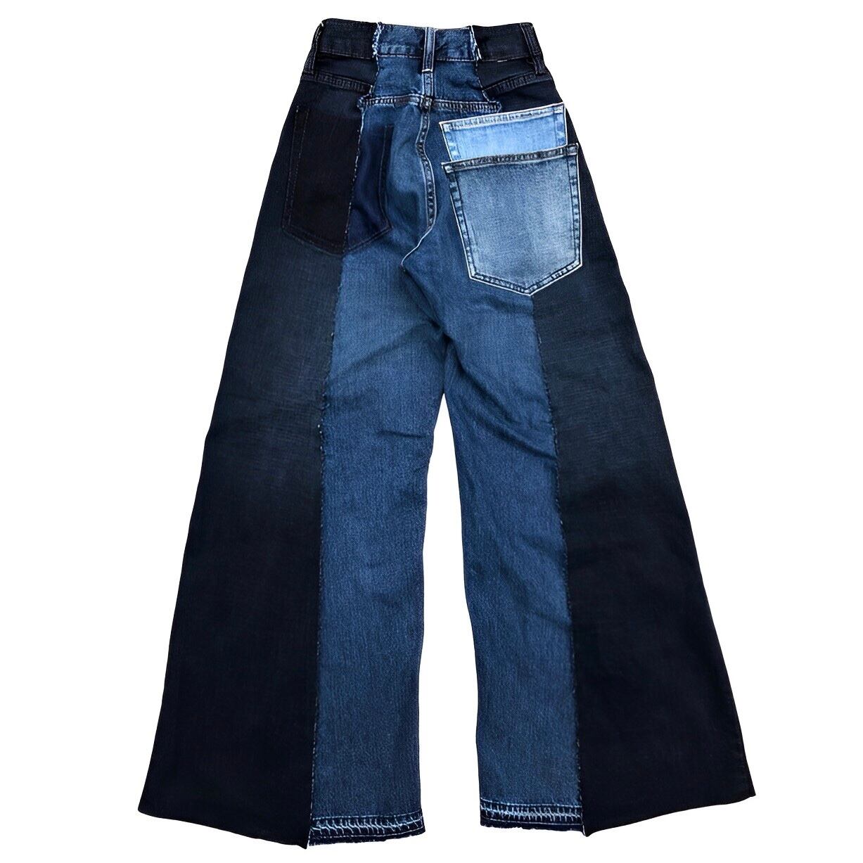 2色のデニムをドッキングさせたワイドフレアパンツ。