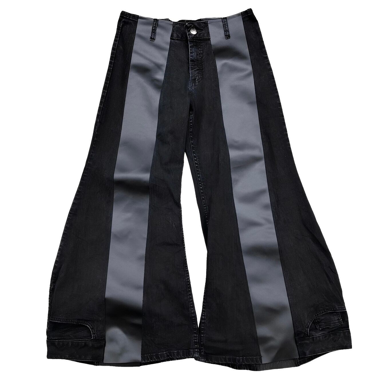 フロントとバックにPVCレザーの切り替えが入ったワイドフレアデニム。