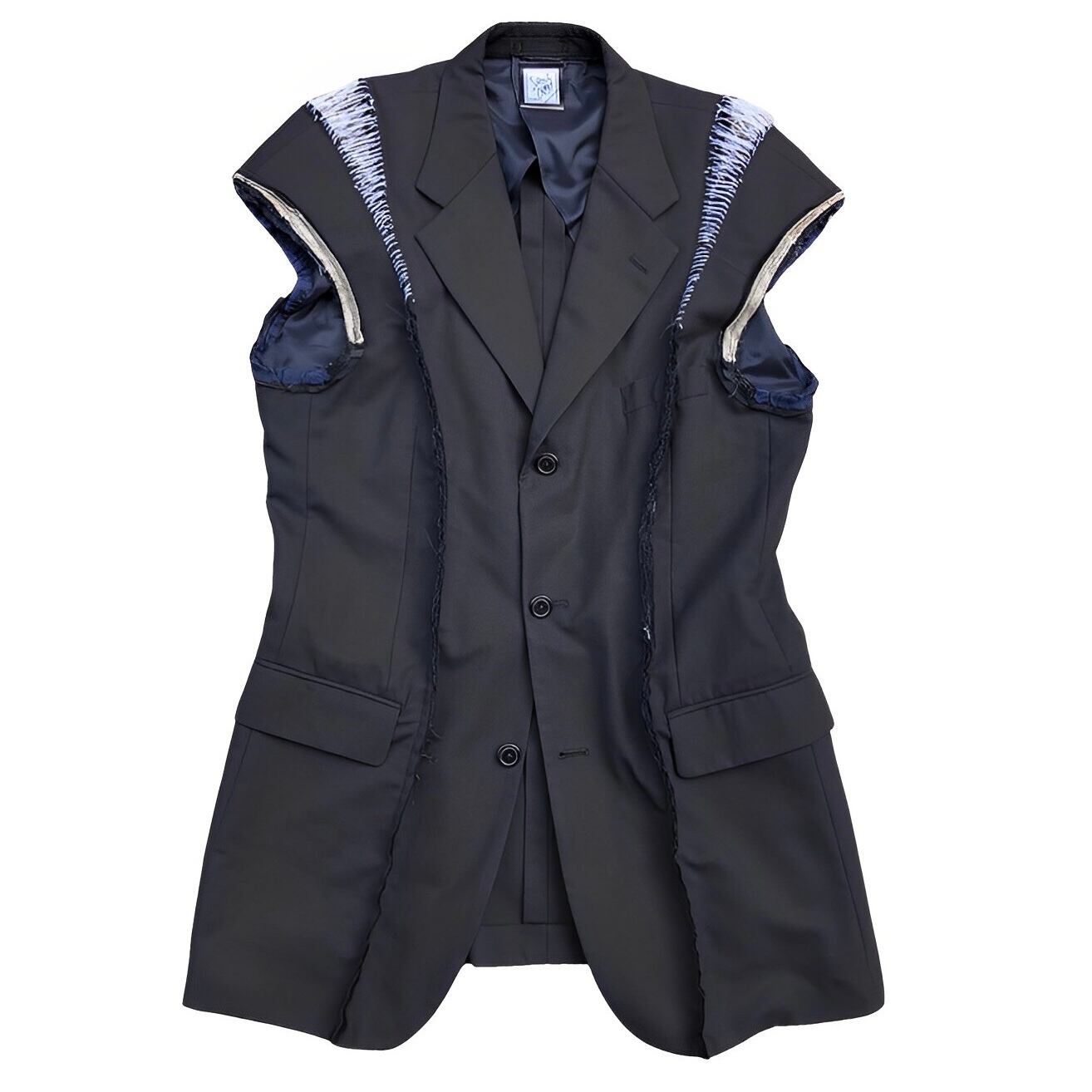 肩の部分が大きく割れ、ステッチが施されたテーラードベスト。