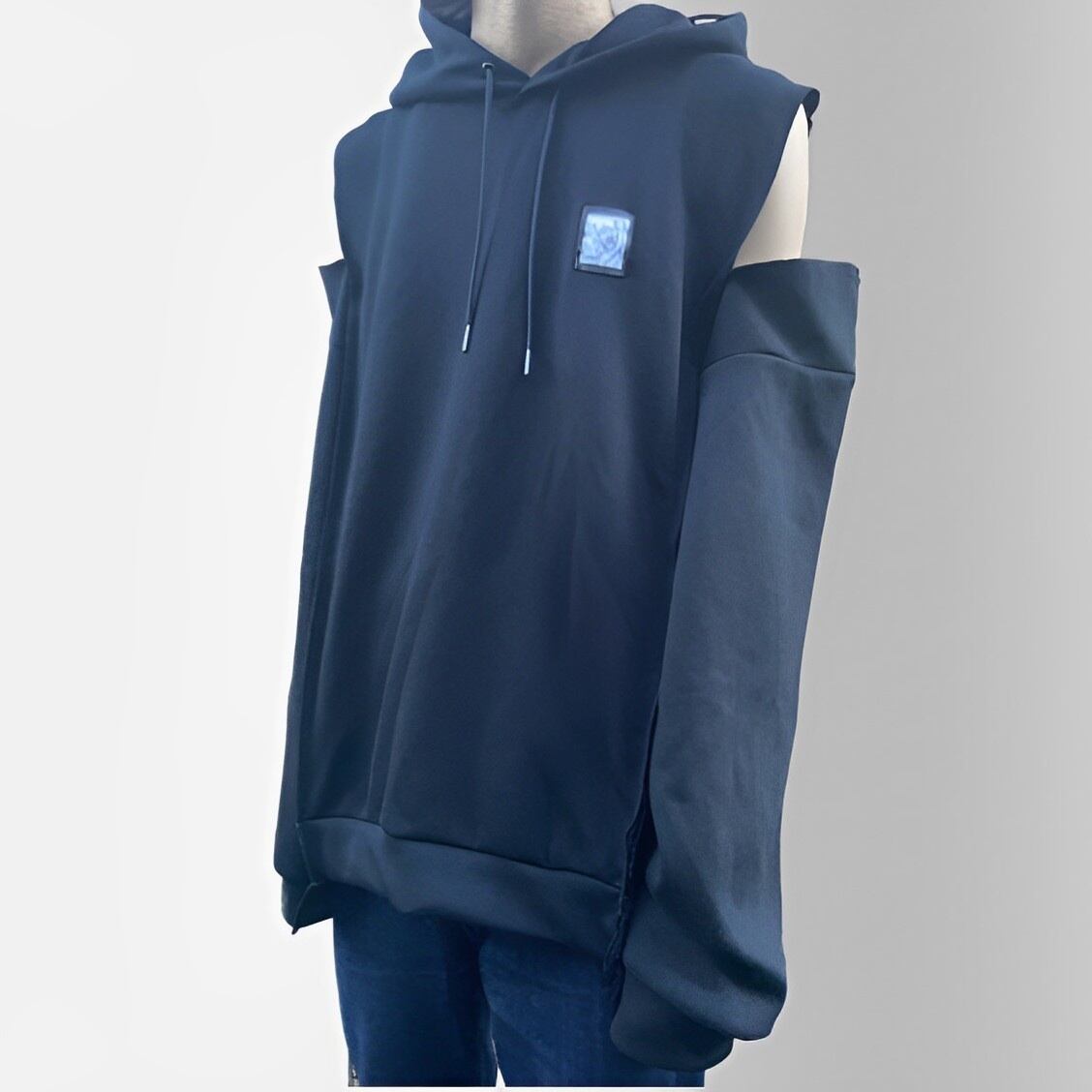 左右の位置が下にずれ肩の部分が割れたフーディー