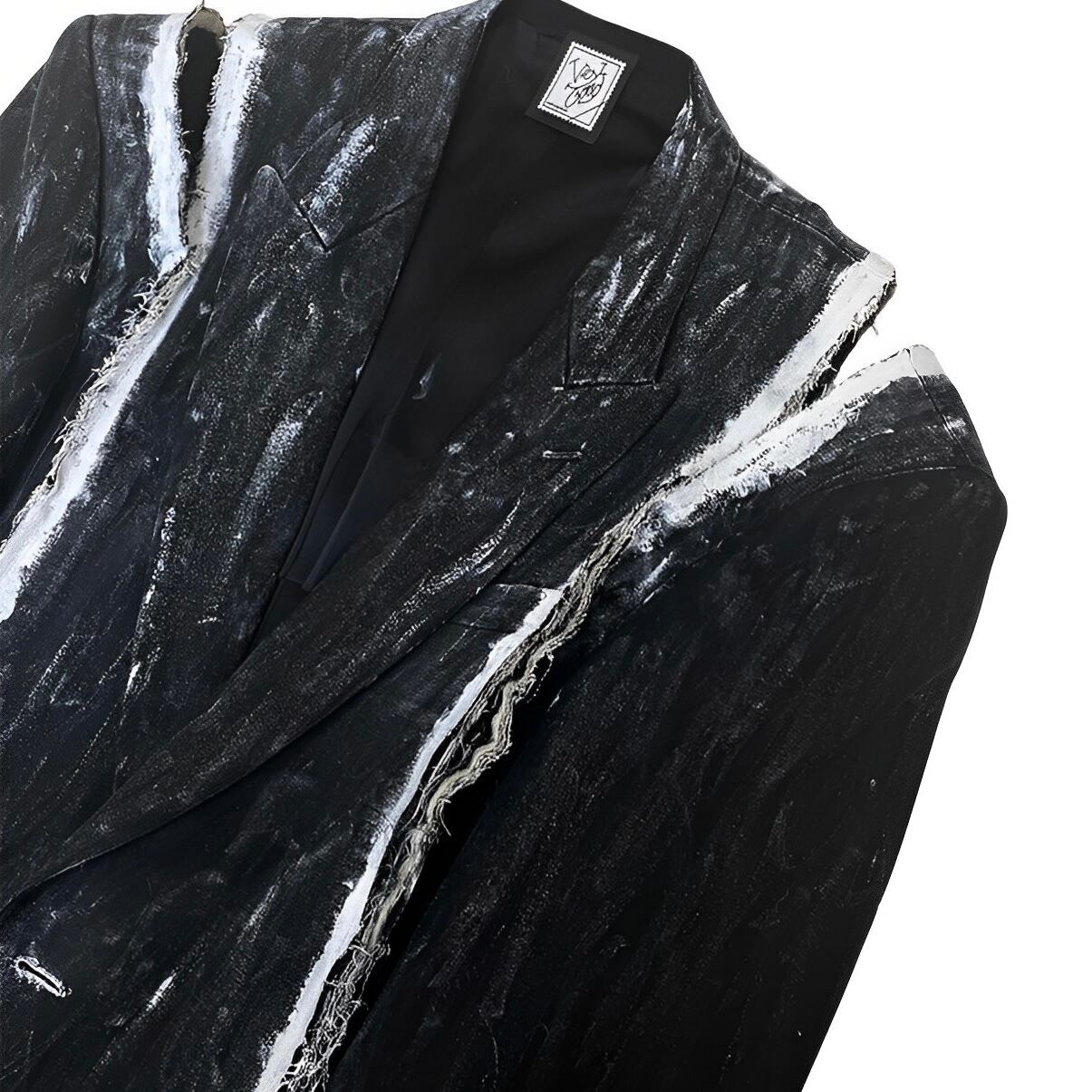 ペイントされた肩の部分が大きく割れたテーラードジャケット。