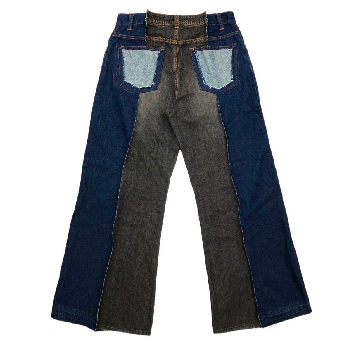 2色のデニムをドッキングさせたワイドフレアパンツ。