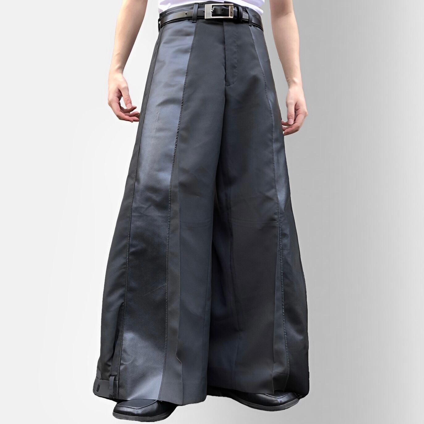 フロントとバックにPVCレザーの切り替えが入ったワイドフレアスラックス。