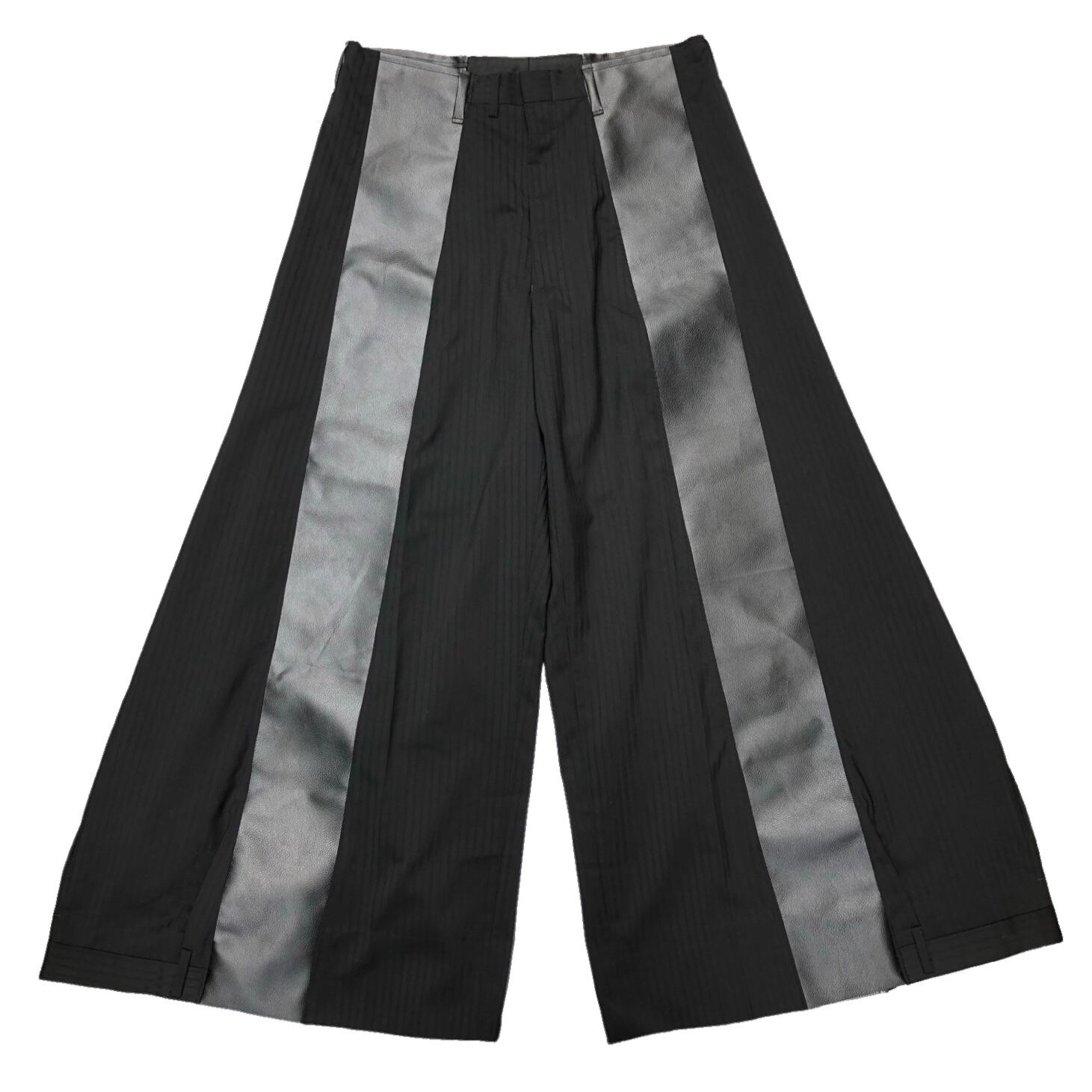 フロントとバックにPVCレザーの切り替えが入ったワイドフレアスラックス。