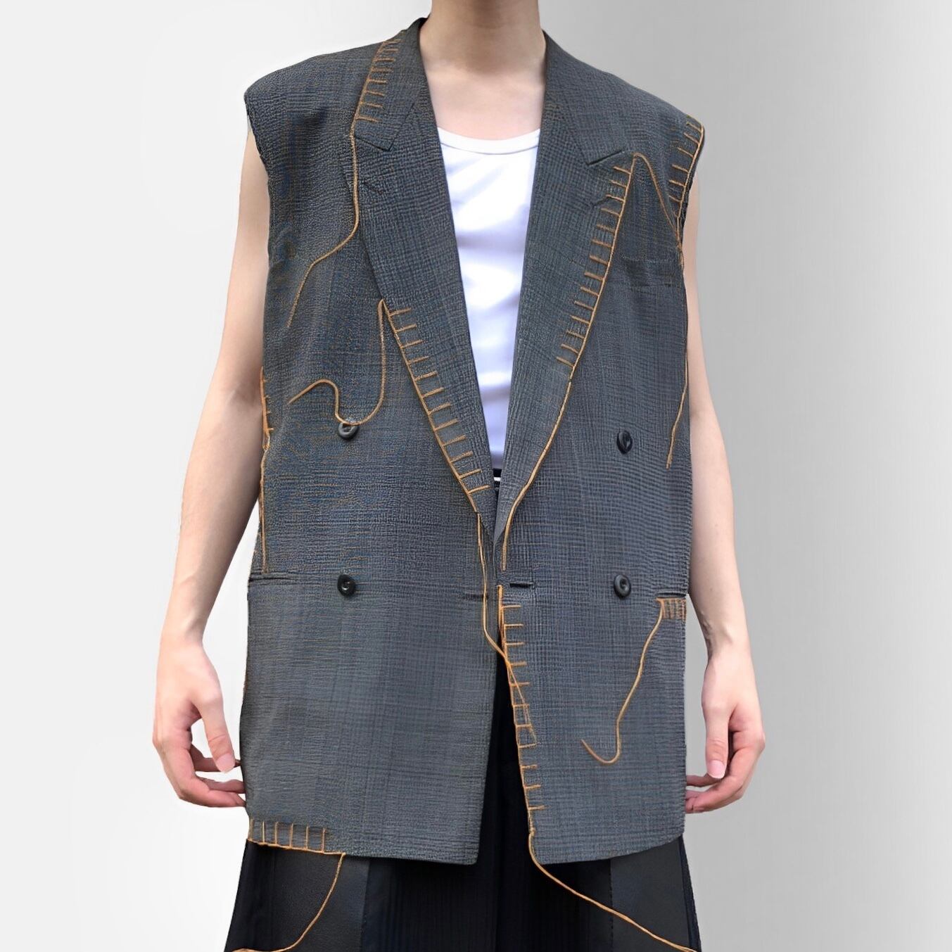ブランケットステッチを施したテーラードベスト。