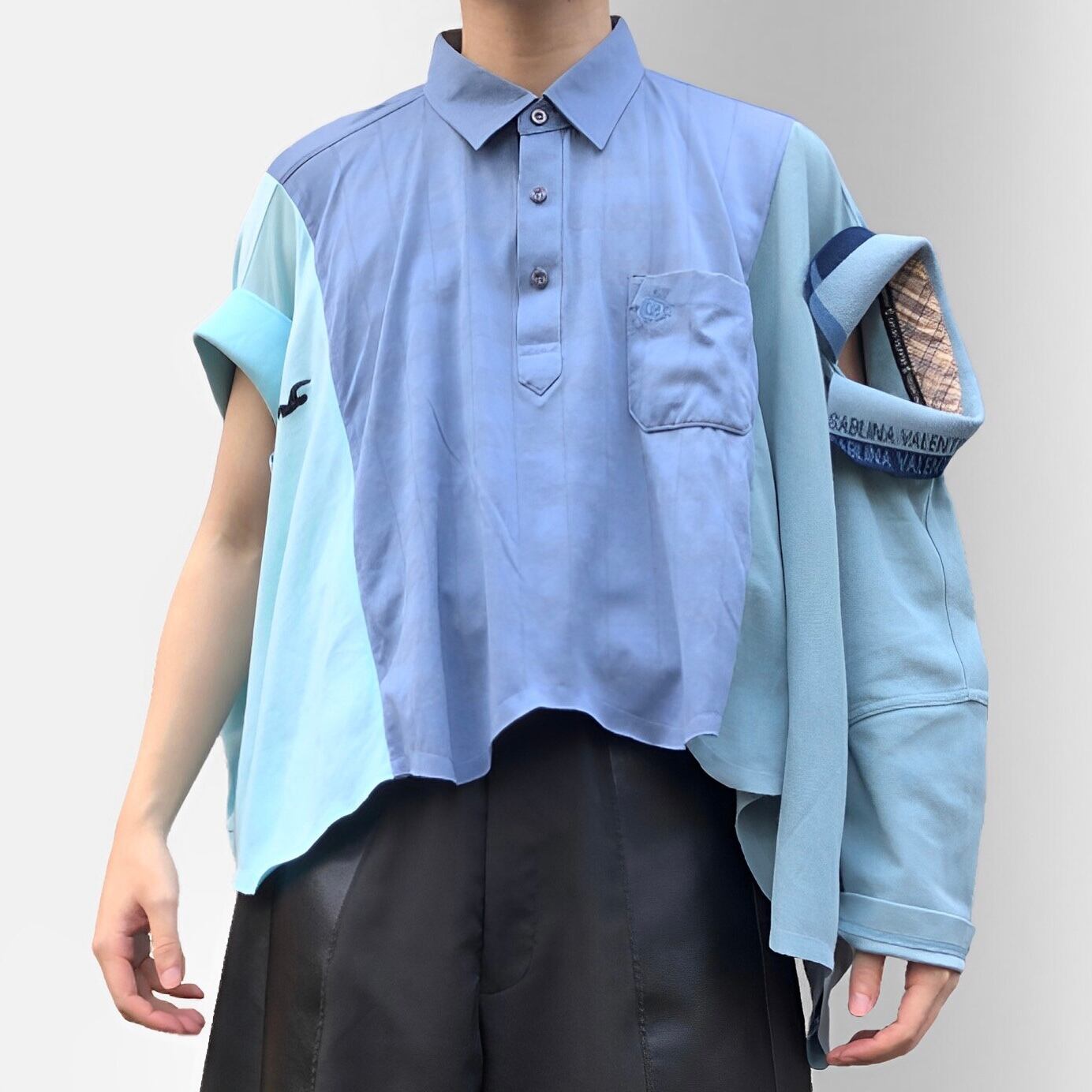ポロシャツを3着ドッキングしたアイテム。腕を通す場所によって着方を変えることができる。