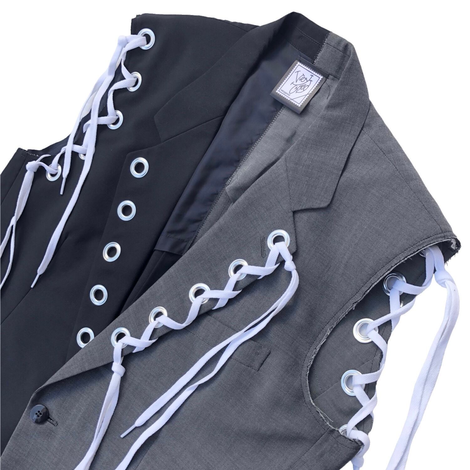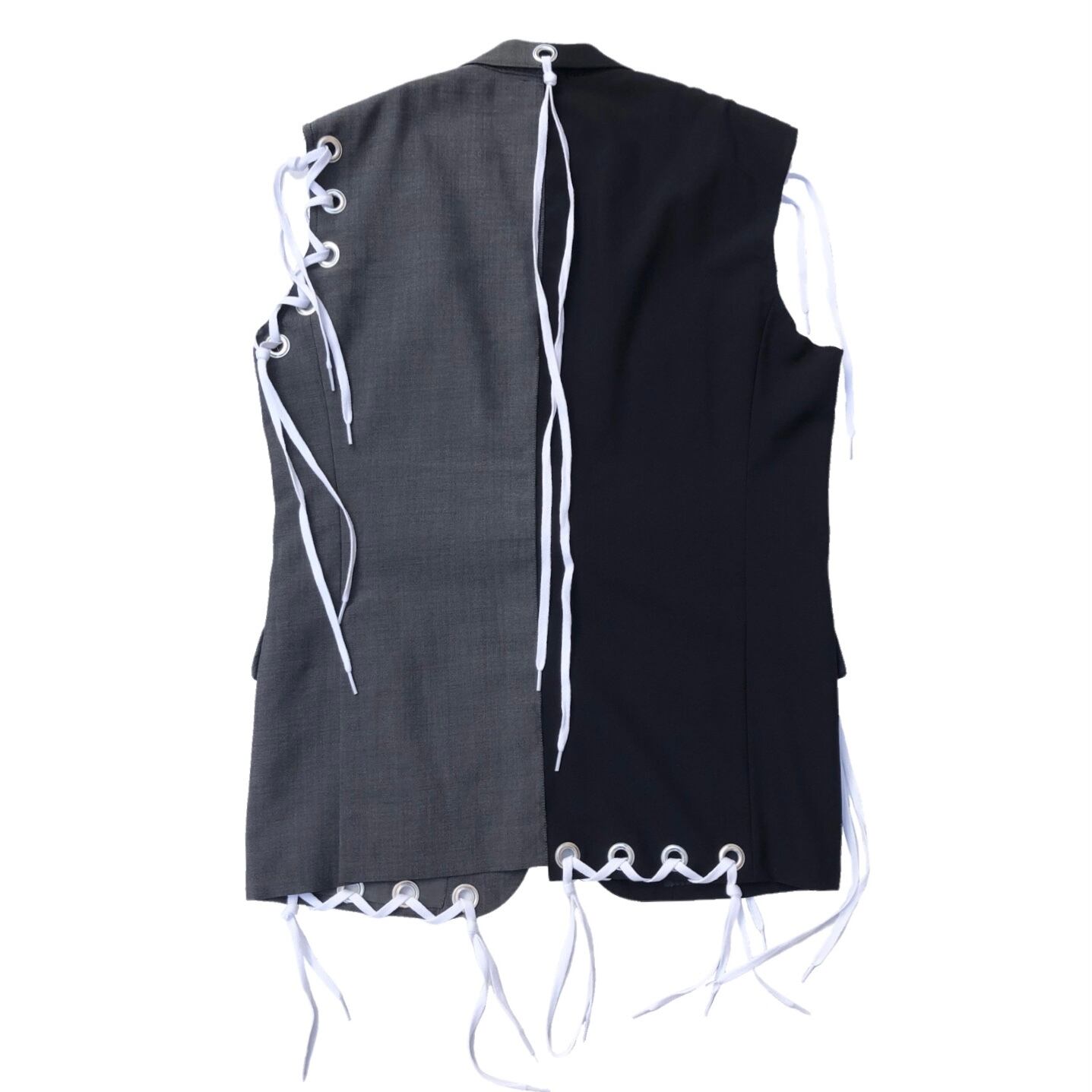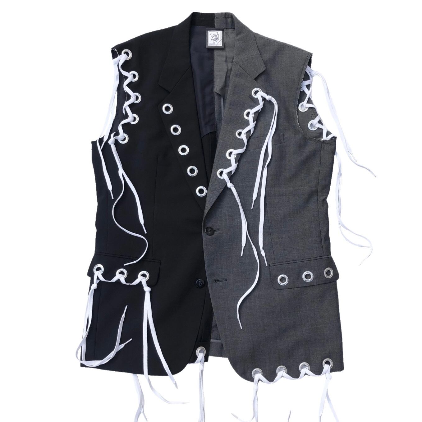 複数のハトメを取り付けたテーラードベスト。