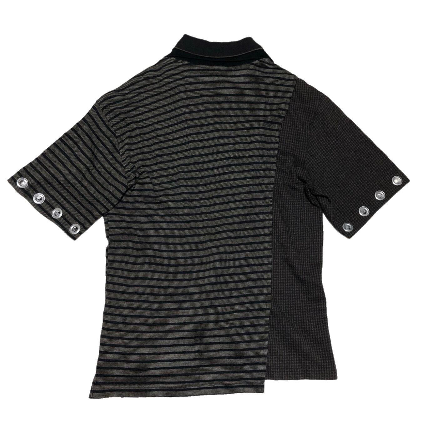 2着のニット生地のポロシャツをレイヤードし、ハトメで繋ぎ合わせた。