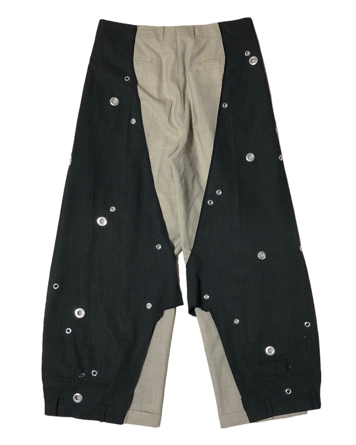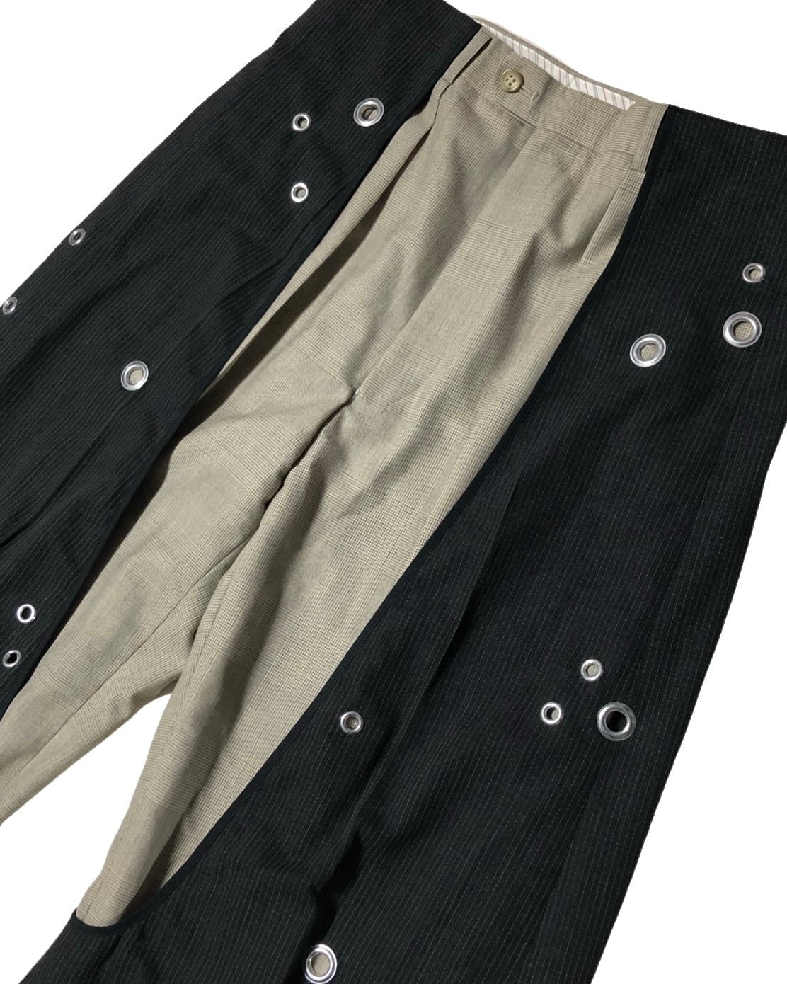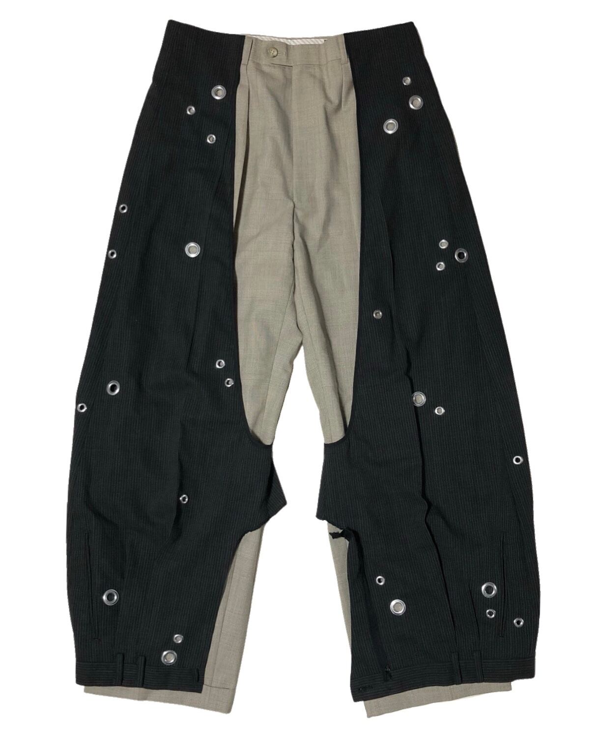 色の異なるスラックスを逆さまにしてレイヤードさせたアイテム。
